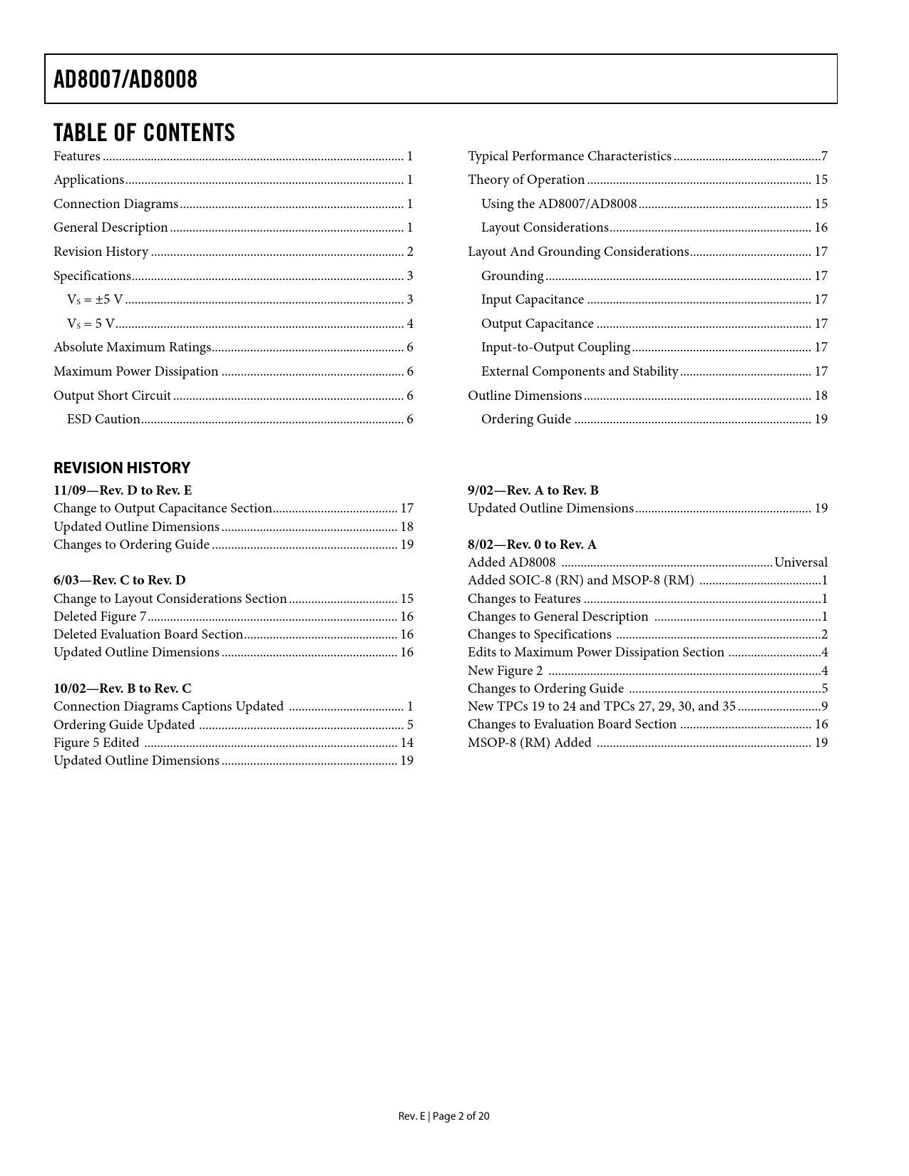 link to page 1 link to page 1 link to page 1 link to page 1 link to page 2 link to page 3 link to page 3 link to page 3 link to page 3 link to page 4 link to page 4 link to page 4 link to page 6 link to page 6 link to page 6 link to page 6 link to page 7 link to page 15 link to page 15 link to page 16 link to page 17 link to page 17 link to page 17 link to page 17 link to page 17 link to page 17 link to page 18 link to page 19 AD8007/AD8008TABLE OF CONTENTS Features .. 1 Typical Performance Characteristics ..7 Applications ... 1 Theory of Operation .. 15 Connection Diagrams .. 1 Using the AD8007/AD8008 .. 15 General Description ... 1 Layout Considerations ... 16 Revision History ... 2 Layout And Grounding Considerations .. 17 Specifications ... 3 Grounding ... 17 VS = ±5 V ... 3 Input Capacitance .. 17 VS = 5 V .. 4 Output Capacitance ... 17 Absolute Maximum Ratings .. 6 Input-to-Output Coupling .. 17 Maximum Power Dissipation ... 6 External Components and Stability ... 17 Output Short Circuit .. 6 Outline Dimensions ... 18 ESD Caution .. 6 Ordering Guide .. 19 REVISION HISTORY11/09—Rev. D to Rev. E9/02—Rev. A to Rev. B Change to Output Capacitance Section ... 17 Updated Outline Dimensions ... 19 Updated Outline Dimensions ... 18 Changes to Ordering Guide .. 19 8/02—Rev. 0 to Rev. A Added AD8008 .. Universal 6/03—Rev. C to Rev. D Added SOIC-8 (RN) and MSOP-8 (RM) .. 1 Change to Layout Considerations Section .. 15 Changes to Features .. 1 Deleted Figure 7 .. 16 Changes to General Description .. 1 Deleted Evaluation Board Section .. 16 Changes to Specifications .. 2 Updated Outline Dimensions ... 16 Edits to Maximum Power Dissipation Section ... 4 New Figure 2 ... 4 10/02—Rev. B to Rev. C Changes to Ordering Guide .. 5 Connection Diagrams Captions Updated .. 1 New TPCs 19 to 24 and TPCs 27, 29, 30, and 35 .. 9 Ordering Guide Updated .. 5 Changes to Evaluation Board Section ... 16 Figure 5 Edited ... 14 MSOP-8 (RM) Added ... 19 Updated Outline Dimensions ... 19 Rev. E | Page 2 of 20 Document Outline FEATURES APPLICATIONS GENERAL DESCRIPTION CONNECTION DIAGRAMS TABLE OF CONTENTS REVISION HISTORY SPECIFICATIONS VS = ±5 V VS = 5 V ABSOLUTE MAXIMUM RATINGS MAXIMUM POWER DISSIPATION OUTPUT SHORT CIRCUIT ESD CAUTION TYPICAL PERFORMANCE CHARACTERISTICS THEORY OF OPERATION USING THE AD8007/AD8008 Supply Decoupling for Low Distortion LAYOUT CONSIDERATIONS LAYOUT AND GROUNDING CONSIDERATIONS GROUNDING INPUT CAPACITANCE OUTPUT CAPACITANCE INPUT-TO-OUTPUT COUPLING EXTERNAL COMPONENTS AND STABILITY OUTLINE DIMENSIONS ORDERING GUIDE