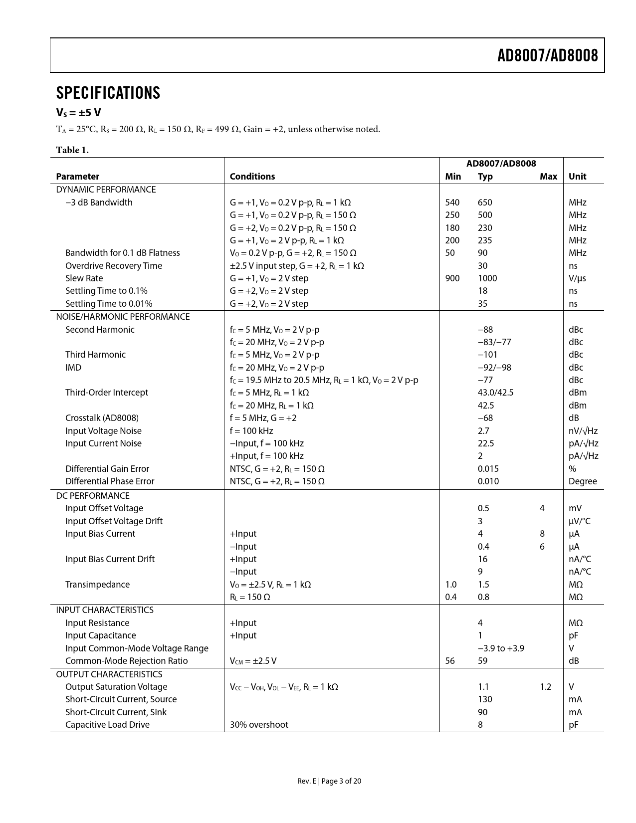 AD8007/AD8008. SPECIFICATIONS VS = ±5 V. Table 1. Parameter. Conditions. Min. Typ. Max. Unit