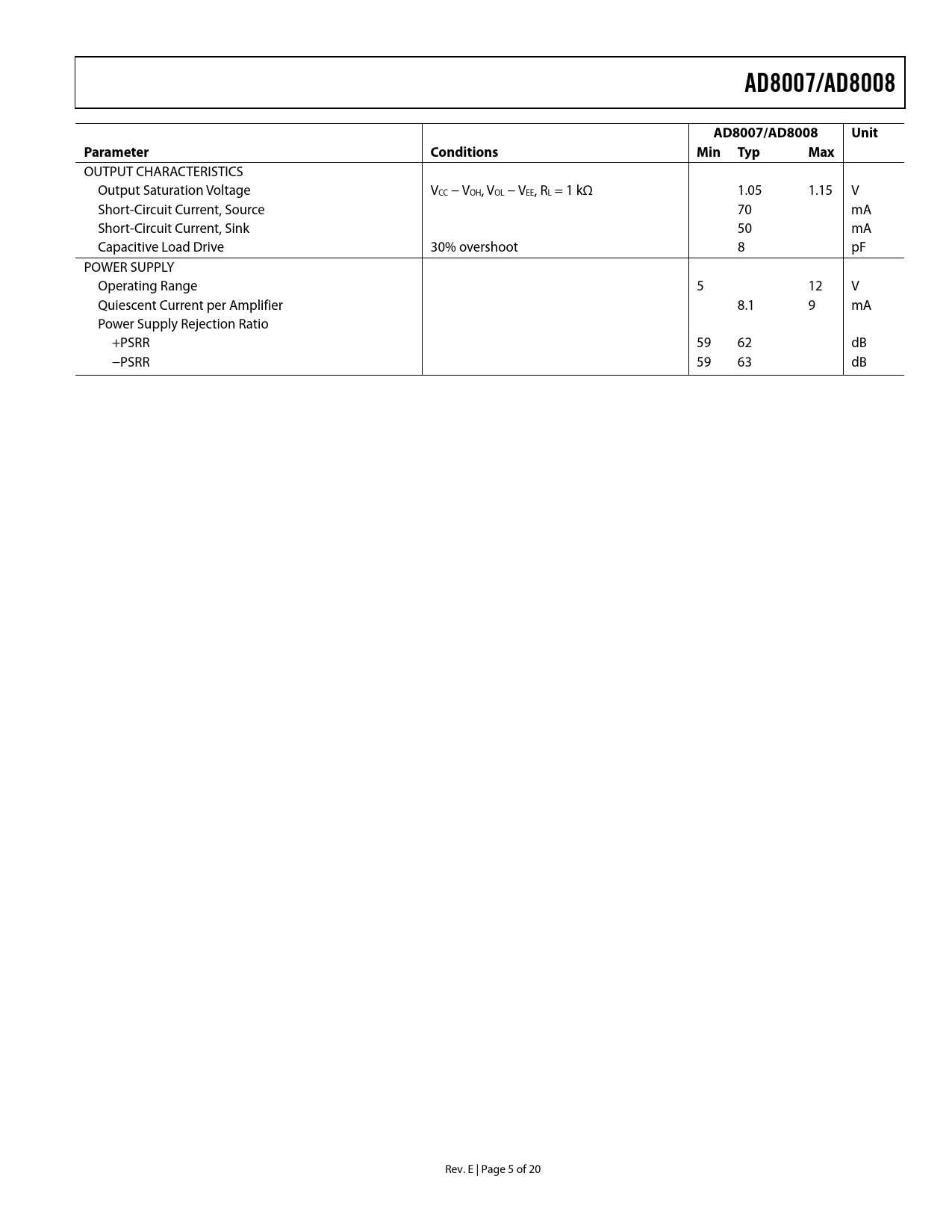 Páginas / Página20 / 5 — AD8007/AD8008. Unit. Parameter. Conditions. Min Typ. Max