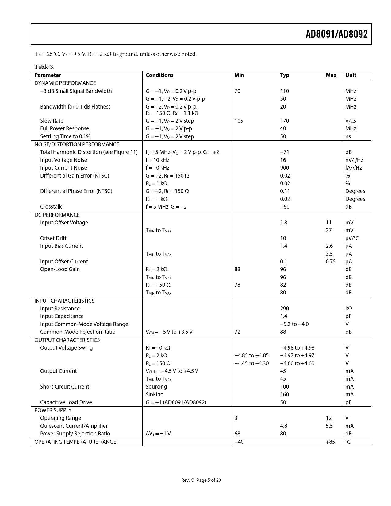 link to page 9 AD8091/AD8092 TA = 25°C, VS = ±5 V, RL = 2 kΩ to ground, unless otherwise noted. Table 3. Parameter ConditionsMinTypMaxUnit DYNAMIC PERFORMANCE −3 dB Small Signal Bandwidth G = +1, VO = 0.2 V p-p 70 110 MHz G = −1, +2, VO = 0.2 V p-p 50 MHz Bandwidth for 0.1 dB Flatness G = +2, VO = 0.2 V p-p, 20 MHz RL = 150 Ω, RF = 1.1 kΩ Slew Rate G = −1, VO = 2 V step 105 170 V/μs Full Power Response G = +1, VO = 2 V p-p 40 MHz Settling Time to 0.1% G = −1, VO = 2 V step 50 ns NOISE/DISTORTION PERFORMANCE Total Harmonic Distortion (see Figure 11) fC = 5 MHz, VO = 2 V p-p, G = +2 −71 dB Input Voltage Noise f = 10 kHz 16 nV/√Hz Input Current Noise f = 10 kHz 900 fA/√Hz Differential Gain Error (NTSC) G = +2, RL = 150 Ω 0.02 % RL = 1 kΩ 0.02 % Differential Phase Error (NTSC) G = +2, RL = 150 Ω 0.11 Degrees RL = 1 kΩ 0.02 Degrees Crosstalk f = 5 MHz, G = +2 −60 dB DC PERFORMANCE Input Offset Voltage 1.8 11 mV TMIN to TMAX 27 mV Offset Drift 10 μV/°C Input Bias Current 1.4 2.6 μA TMIN to TMAX 3.5 μA Input Offset Current 0.1 0.75 μA Open-Loop Gain RL = 2 kΩ 88 96 dB TMIN to TMAX 96 dB RL = 150 Ω 78 82 dB TMIN to TMAX 80 dB INPUT CHARACTERISTICS Input Resistance 290 kΩ Input Capacitance 1.4 pF Input Common-Mode Voltage Range −5.2 to +4.0 V Common-Mode Rejection Ratio VCM = −5 V to +3.5 V 72 88 dB OUTPUT CHARACTERISTICS Output Voltage Swing RL = 10 kΩ −4.98 to +4.98 V RL = 2 kΩ −4.85 to +4.85 −4.97 to +4.97 V RL = 150 Ω −4.45 to +4.30 −4.60 to +4.60 V Output Current VOUT = −4.5 V to +4.5 V 45 mA TMIN to TMAX 45 mA Short Circuit Current Sourcing 100 mA Sinking 160 mA Capacitive Load Drive G = +1 (AD8091/AD8092) 50 pF POWER SUPPLY Operating Range 3 12 V Quiescent Current/Amplifier 4.8 5.5 mA Power Supply Rejection Ratio ΔVS = ±1 V 68 80 dB OPERATING TEMPERATURE RANGE −40 +85 °C Rev. C | Page 5 of 20 Document Outline FEATURES APPLICATIONS CONNECTION DIAGRAMS GENERAL DESCRIPTION TABLE OF CONTENTS REVISION HISTORY SPECIFICATIONS ABSOLUTE MAXIMUM RATINGS ESD CAUTION MAXIMUM POWER DISSIPATION TYPICAL PERFORMANCE CHARACTERISTICS LAYOUT, GROUNDING, AND BYPASSING CONSIDERATIONS POWER SUPPLY BYPASSING GROUNDING INPUT CAPACITANCE INPUT-TO-OUTPUT COUPLING DRIVING CAPACITIVE LOADS OVERDRIVE RECOVERY ACTIVE FILTERS SYNC STRIPPER SINGLE-SUPPLY COMPOSITE VIDEO LINE DRIVER OUTLINE DIMENSIONS ORDERING GUIDE