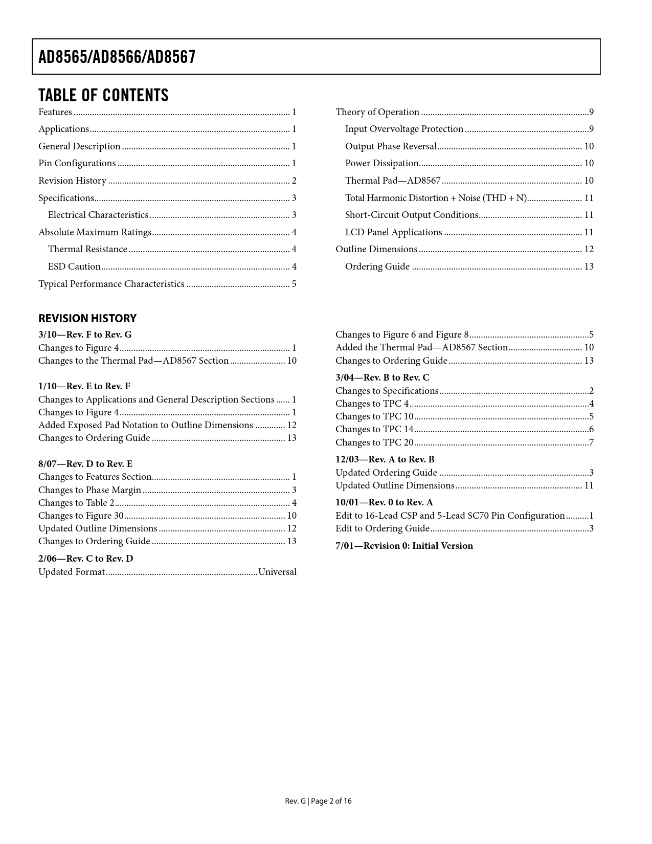 link to page 1 link to page 1 link to page 1 link to page 1 link to page 2 link to page 3 link to page 3 link to page 4 link to page 4 link to page 4 link to page 5 link to page 9 link to page 9 link to page 10 link to page 10 link to page 10 link to page 11 link to page 11 link to page 11 link to page 12 link to page 13 AD8565/AD8566/AD8567TABLE OF CONTENTS Features .. 1 Theory of Operation ...9 Applications ... 1 Input Overvoltage Protection ..9 General Description ... 1 Output Phase Reversal ... 10 Pin Configurations ... 1 Power Dissipation... 10 Revision History ... 2 Thermal Pad—AD8567 ... 10 Specifications ... 3 Total Harmonic Distortion + Noise (THD + N).. 11 Electrical Characteristics ... 3 Short-Circuit Output Conditions... 11 Absolute Maximum Ratings .. 4 LCD Panel Applications .. 11 Thermal Resistance .. 4 Outline Dimensions ... 12 ESD Caution .. 4 Ordering Guide .. 13 Typical Performance Characteristics ... 5 REVISION HISTORY 3/10—Rev. F to Rev. G Changes to Figure 6 and Figure 8 .. 5 Changes to Figure 4 .. 1 Added the Thermal Pad—AD8567 Section .. 10 Changes to the Thermal Pad—AD8567 Section .. 10 Changes to Ordering Guide .. 13 3/04—Rev. B to Rev. C1/10—Rev. E to Rev. F Changes to Specifications ... 2 Changes to Applications and General Description Sections .. 1 Changes to TPC 4 .. 4 Changes to Figure 4 .. 1 Changes to TPC 10 .. 5 Added Exposed Pad Notation to Outline Dimensions ... 12 Changes to TPC 14 .. 6 Changes to Ordering Guide .. 13 Changes to TPC 20 .. 7 8/07—Rev. D to Rev. E12/03—Rev. A to Rev. B Changes to Features Section.. 1 Updated Ordering Guide ... 3 Changes to Phase Margin .. 3 Updated Outline Dimensions ... 11 Changes to Table 2 .. 4 10/01—Rev. 0 to Rev. A Changes to Figure 30 .. 10 Edit to 16-Lead CSP and 5-Lead SC70 Pin Configuration .. 1 Updated Outline Dimensions ... 12 Edit to Ordering Guide ... 3 Changes to Ordering Guide .. 13 7/01—Revision 0: Initial Version2/06—Rev. C to Rev. D Updated Format .. Universal Rev. G | Page 2 of 16 Document Outline Features Applications General Description Pin Configurations Revision History Specifications Electrical Characteristics Absolute Maximum Ratings Thermal Resistance ESD Caution Typical Performance Characteristics Theory of Operation Input Overvoltage Protection Output Phase Reversal Power Dissipation Thermal Pad—AD8567 Total Harmonic Distortion + Noise (THD + N) Short-Circuit Output Conditions LCD Panel Applications Outline Dimensions Ordering Guide