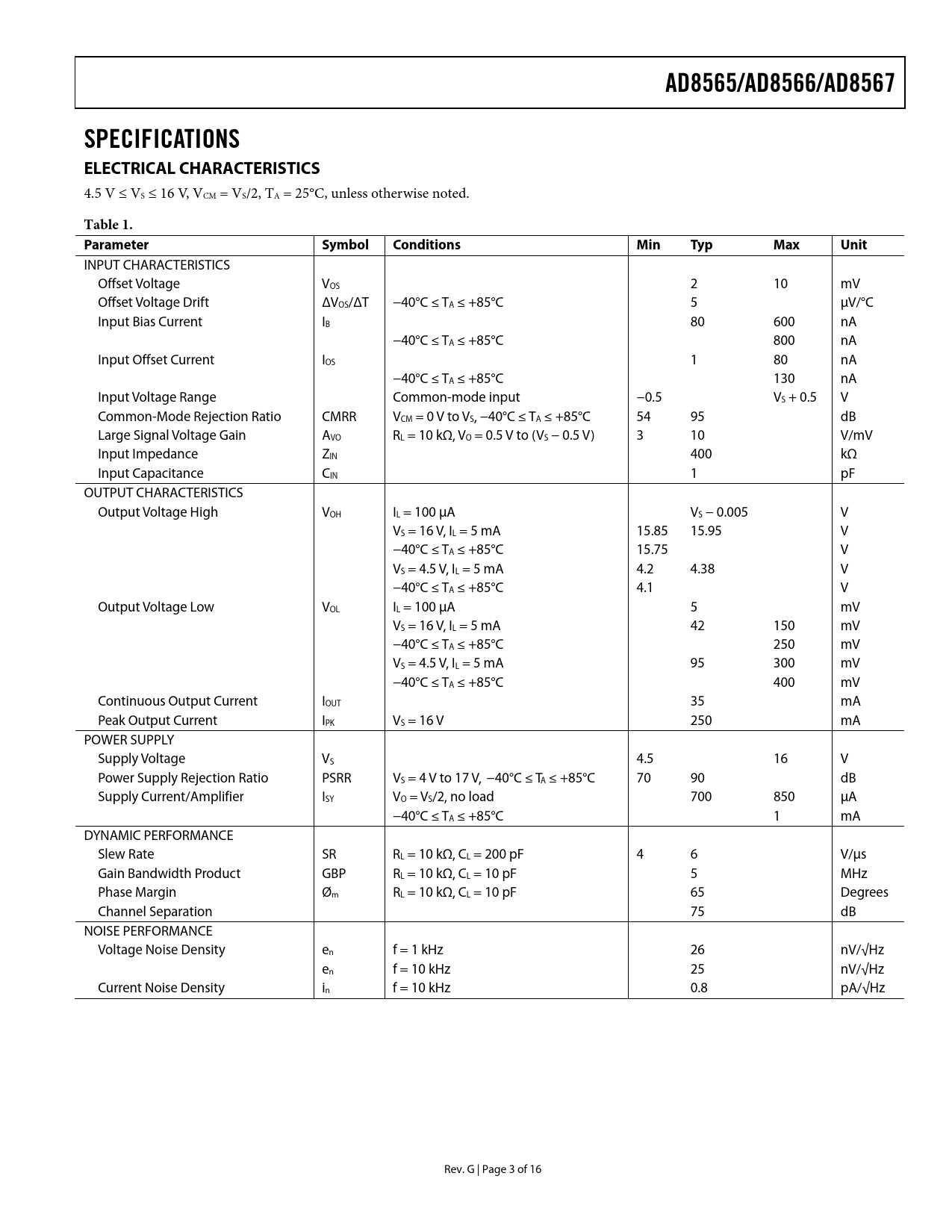 AD8565/AD8566/AD8567SPECIFICATIONS ELECTRICAL CHARACTERISTICS 4.5 V ≤ VS ≤ 16 V, VCM = VS/2, TA = 25°C, unless otherwise noted. Table 1. ParameterSymbolConditionsMinTypMaxUnit INPUT CHARACTERISTICS Offset Voltage VOS 2 10 mV Offset Voltage Drift ΔVOS/ΔT −40°C ≤ TA ≤ +85°C 5 µV/°C Input Bias Current IB 80 600 nA −40°C ≤ TA ≤ +85°C 800 nA Input Offset Current IOS 1 80 nA −40°C ≤ TA ≤ +85°C 130 nA Input Voltage Range Common-mode input −0.5 VS + 0.5 V Common-Mode Rejection Ratio CMRR VCM = 0 V to VS, −40°C ≤ TA ≤ +85°C 54 95 dB Large Signal Voltage Gain AVO RL = 10 kΩ, VO = 0.5 V to (VS − 0.5 V) 3 10 V/mV Input Impedance ZIN 400 kΩ Input Capacitance CIN 1 pF OUTPUT CHARACTERISTICS Output Voltage High VOH IL = 100 µA VS − 0.005 V VS = 16 V, IL = 5 mA 15.85 15.95 V −40°C ≤ TA ≤ +85°C 15.75 V VS = 4.5 V, IL = 5 mA 4.2 4.38 V −40°C ≤ TA ≤ +85°C 4.1 V Output Voltage Low VOL IL = 100 µA 5 mV VS = 16 V, IL = 5 mA 42 150 mV −40°C ≤ TA ≤ +85°C 250 mV VS = 4.5 V, IL = 5 mA 95 300 mV −40°C ≤ TA ≤ +85°C 400 mV Continuous Output Current IOUT 35 mA Peak Output Current IPK VS = 16 V 250 mA POWER SUPPLY Supply Voltage VS 4.5 16 V Power Supply Rejection Ratio PSRR VS = 4 V to 17 V, −40°C ≤ TA ≤ +85°C 70 90 dB Supply Current/Amplifier ISY VO = VS/2, no load 700 850 µA −40°C ≤ TA ≤ +85°C 1 mA DYNAMIC PERFORMANCE Slew Rate SR RL = 10 kΩ, CL = 200 pF 4 6 V/µs Gain Bandwidth Product GBP RL = 10 kΩ, CL = 10 pF 5 MHz Phase Margin Øm RL = 10 kΩ, CL = 10 pF 65 Degrees Channel Separation 75 dB NOISE PERFORMANCE Voltage Noise Density en f = 1 kHz 26 nV/√Hz en f = 10 kHz 25 nV/√Hz Current Noise Density in f = 10 kHz 0.8 pA/√Hz Rev. G | Page 3 of 16 Document Outline Features Applications General Description Pin Configurations Revision History Specifications Electrical Characteristics Absolute Maximum Ratings Thermal Resistance ESD Caution Typical Performance Characteristics Theory of Operation Input Overvoltage Protection Output Phase Reversal Power Dissipation Thermal Pad—AD8567 Total Harmonic Distortion + Noise (THD + N) Short-Circuit Output Conditions LCD Panel Applications Outline Dimensions Ordering Guide