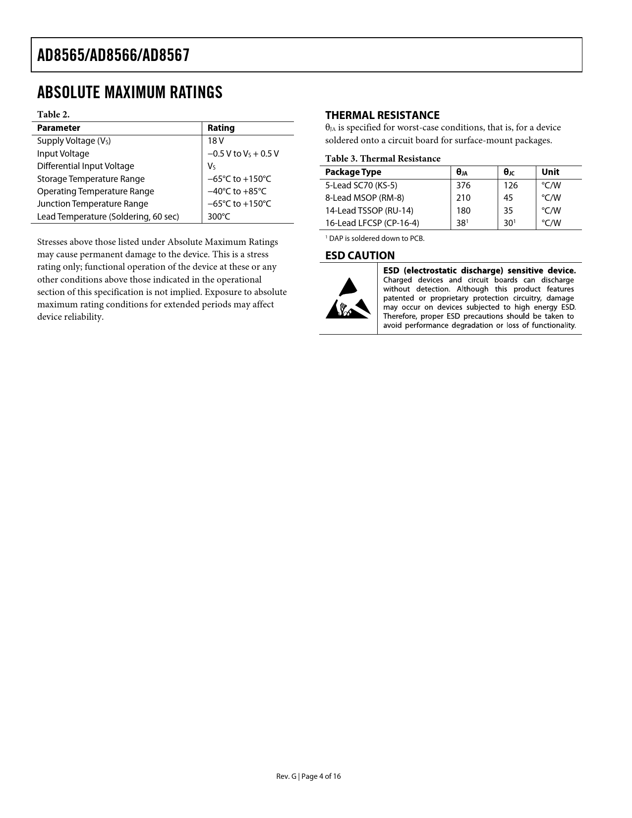 AD8565/AD8566/AD8567. ABSOLUTE MAXIMUM RATINGS Table 2. THERMAL RESISTANCE. Parameter. Rating. Table 3. Thermal Resistance