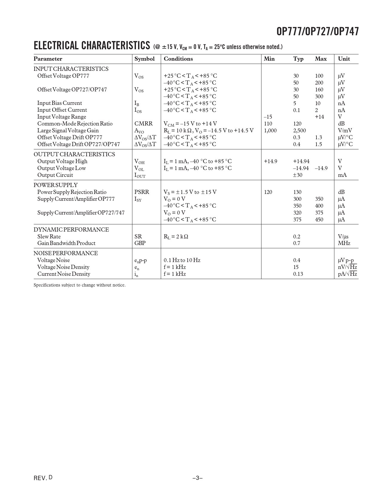 OP777/OP727/OP747 ELECTRICAL CHARACTERISTICS (@ 15 V, VCM = 0 V, TA = 25 C unless otherwise noted.) Parameter Symbol Conditions Min Typ Max Unit