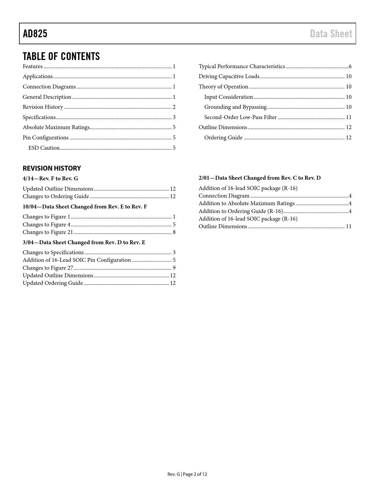 link to page 1 link to page 1 link to page 1 link to page 1 link to page 6 link to page 6 link to page 7 link to page 11 link to page 11 link to page 11 link to page 11 link to page 12 link to page 13 link to page 13 link to page 4 link to page 3 link to page 6 AD825Data SheetTABLE OF CONTENTS Features .. 1 Typical Performance Characteristics ..6 Applications ... 1 Driving Capacitive Loads .. 10 Connection Diagrams .. 1 Theory of Operation .. 10 General Description ... 1 Input Consideration ... 10 Revision History ... 2 Grounding and Bypassing ... 10 Specifications ... 3 Second-Order Low-Pass Filter ... 11 Absolute Maximum Ratings .. 5 Outline Dimensions ... 12 Pin Configurations ... 5 Ordering Guide .. 12 ESD Caution .. 5 REVISION HISTORY 4/14—Rev. F to Rev. G2/01—Data Sheet Changed from Rev. C to Rev. D Updated Outline Dimensions ... 12 Addition of 16-lead SOIC package (R-16) Changes to Ordering Guide .. 12 Connection Diagram .. 4 10/04—Data Sheet Changed from Rev. E to Rev. F Addition to Absolute Maximum Ratings ... 4 Addition to Ordering Guide (R-16) .. 4 Changes to Figure 1 .. 1 Addition of 16-lead SOIC package (R-16) Changes to Figure 4 .. 5 Outline Dimensions ... 11 Changes to Figure 21 .. 8 3/04—Data Sheet Changed from Rev. D to Rev. E Changes to Specifications .. 3 Addition of 16-Lead SOIC Pin Configuration ... 5 Changes to Figure 27 .. 9 Updated Outline Dimensions ... 12 Updated Ordering Guide ... 12 Rev. G | Page 2 of 12 Document Outline Features Applications Connection Diagrams General Description Table of Contents Revision History Specifications Absolute Maximum Ratings Pin Configurations ESD Caution Typical Performance Characteristics Driving Capacitive Loads Theory of Operation Input Consideration Grounding and Bypassing Second-Order Low-Pass Filter Outline Dimensions Ordering Guide