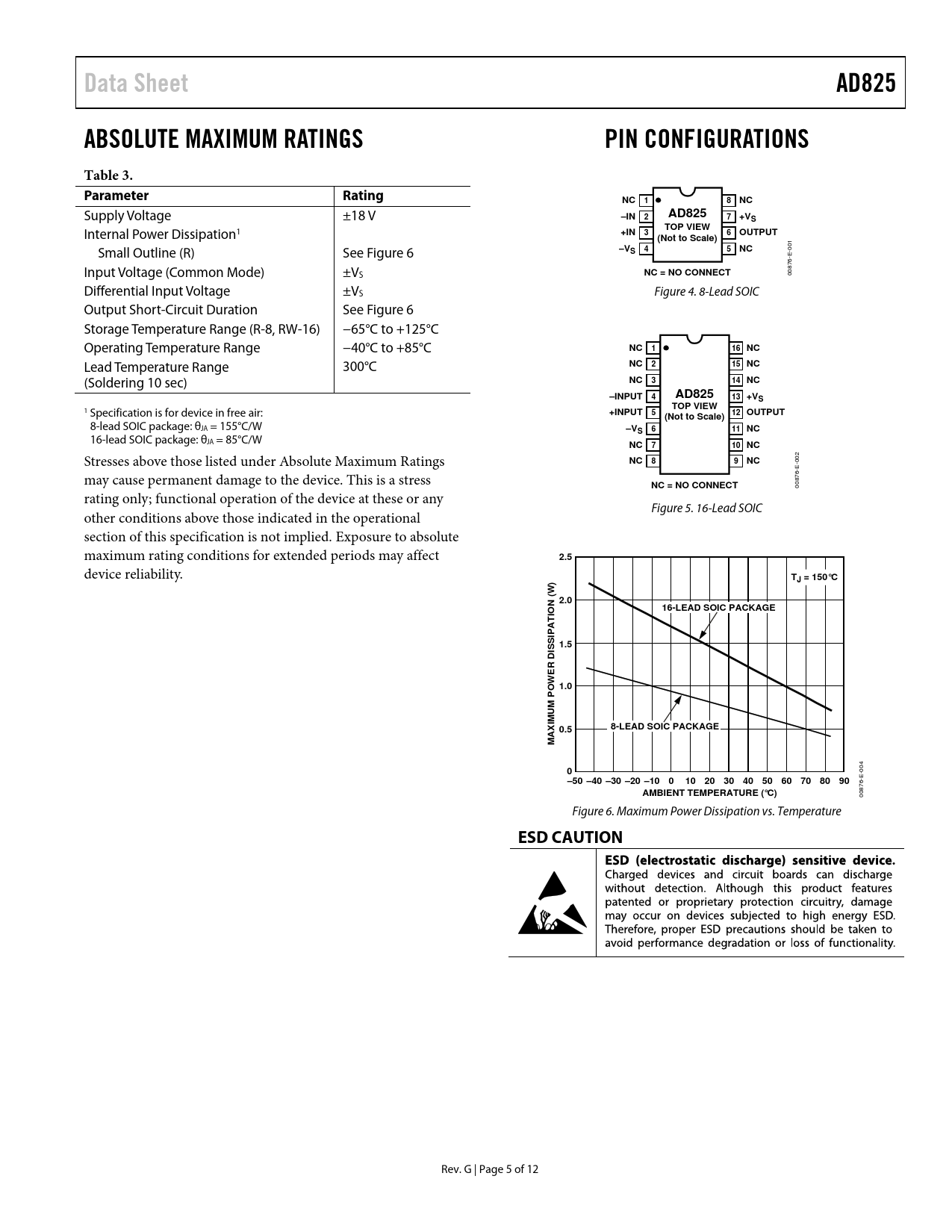 link to page 6 link to page 6 Data SheetAD825ABSOLUTE MAXIMUM RATINGSPIN CONFIGURATIONSTable 3.Parameter RatingNC18NC Supply Voltage ±18 V –IN2AD8257+VSTOP VIEW Internal Power Dissipation1 +IN36OUTPUT(Not to Scale) Small Outline (R) See Figure 6 –VS 45NC -001 Input Voltage (Common Mode) ±VS NC = NO CONNECT 00876-E Differential Input Voltage ±VS Figure 4. 8-Lead SOIC Output Short-Circuit Duration See Figure 6 Storage Temperature Range (R-8, RW-16) −65°C to +125°C Operating Temperature Range −40°C to +85°C NC116 NC Lead Temperature Range 300°C NC215 NC (Soldering 10 sec) NC314 NC–INPUT4AD82513 +VSTOP VIEW 1 Specification is for device in free air: +INPUT512 OUTPUT(Not to Scale) 8-lead SOIC package: θJA = 155°C/W –VS 611 NC 16-lead SOIC package: θJA = 85°C/W NC710 NC Stresses above those listed under Absolute Maximum Ratings NC89NC -002 may cause permanent damage to the device. This is a stress NC = NO CONNECT 00876-E rating only; functional operation of the device at these or any Figure 5. 16-Lead SOIC other conditions above those indicated in the operational section of this specification is not implied. Exposure to absolute maximum rating conditions for extended periods may affect 2.5 device reliability. TJ = 150°C) W ( 2.016-LEAD SOIC PACKAGETION1.5ISSIPA D R E1.0POW M UXIM 0.58-LEAD SOIC PACKAGEA M0 -004 –50 –40 –30 –20 –100102030405060708090AMBIENT TEMPERATURE (°C) 00876-E Figure 6. Maximum Power Dissipation vs. Temperature ESD CAUTION Rev. G | Page 5 of 12 Document Outline Features Applications Connection Diagrams General Description Table of Contents Revision History Specifications Absolute Maximum Ratings Pin Configurations ESD Caution Typical Performance Characteristics Driving Capacitive Loads Theory of Operation Input Consideration Grounding and Bypassing Second-Order Low-Pass Filter Outline Dimensions Ordering Guide