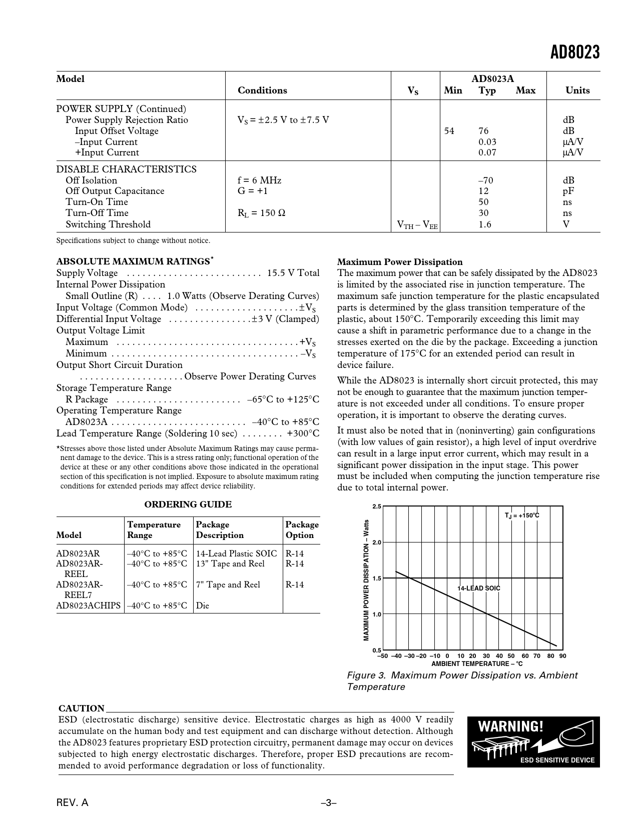AD8023 Model AD8023A Conditions Min Typ Max Units ABSOLUTE MAXIMUM RATINGS* Maximum Power Dissipation ORDERING GUIDE 2.5 TJ = +150
