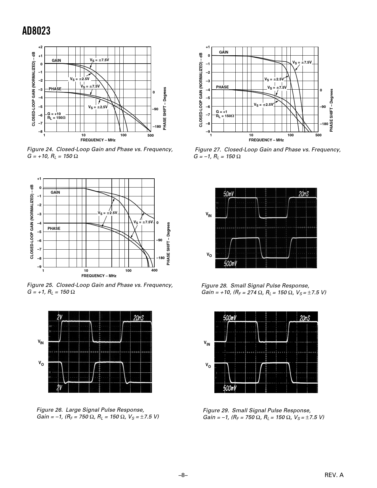 AD8023. GAIN. S =. 7.5V. VS =. 2.5V. PHASE. Degrees –. Degrees. –90. G = +1. G = +10. L = 150. CLOSED-LOOP GAIN (NORMALIZED). –180. PHASE SHIFT. 100. 500