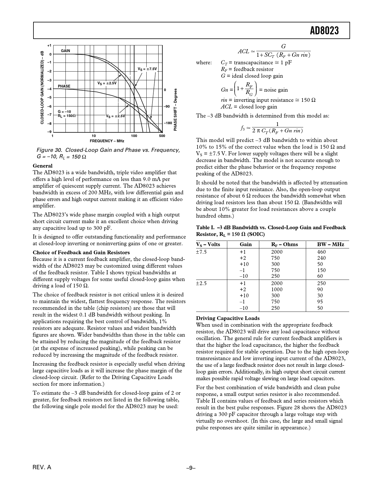 Table I. –3 dB Bandwidth vs. Closed-Loop Gain and Feedback Resistor, RL = 150 (SOIC)