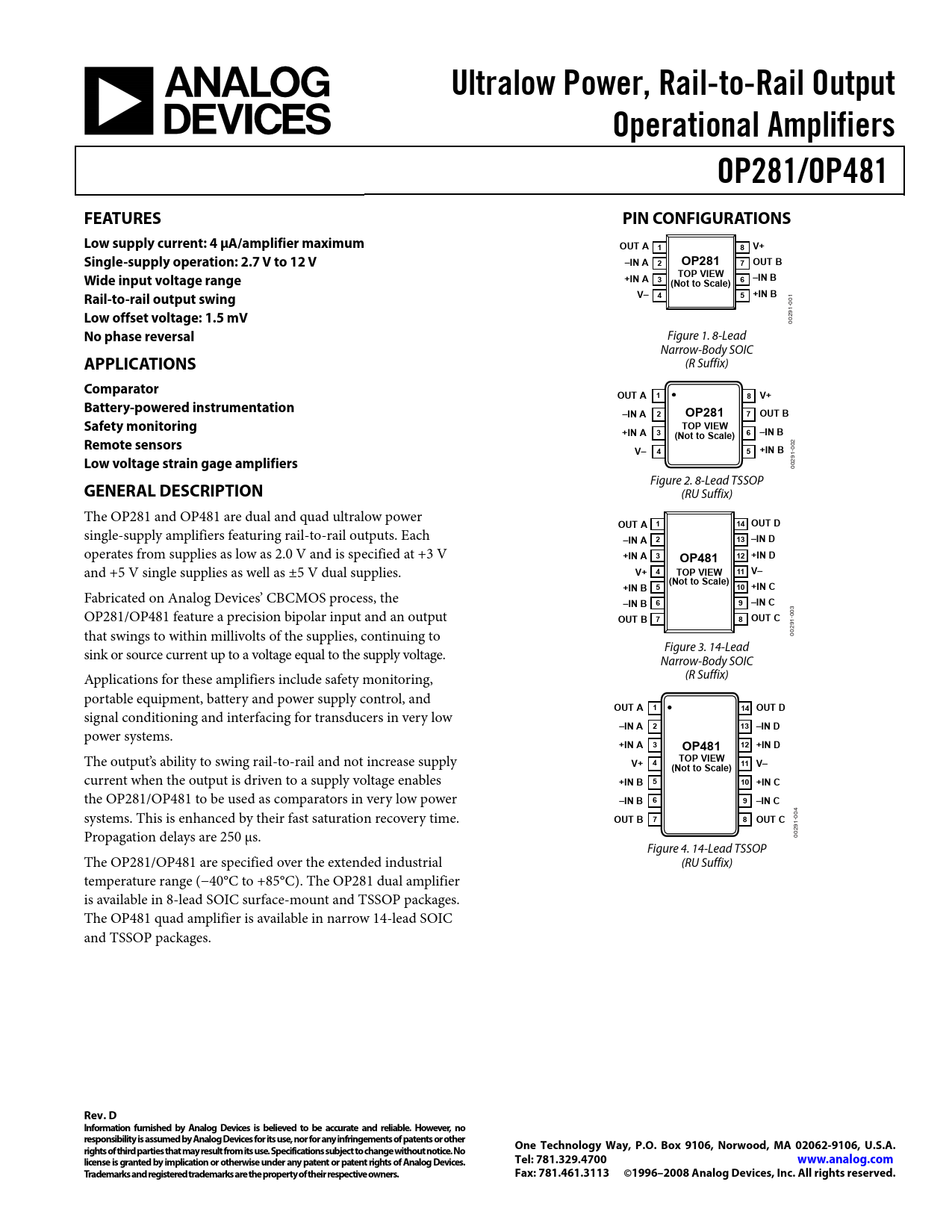 0 1- Propagation delays are 250 μs. 029 0 Figure 4. 14-Lead TSSOP The OP281/OP481 are specified over the extended industrial (RU Suffix) temperature range (−40°C to +85°C). The OP281 dual amplifier is available in 8-lead SOIC surface-mount and TSSOP packages. The OP481 quad amplifier is available in narrow 14-lead SOIC and TSSOP packages.