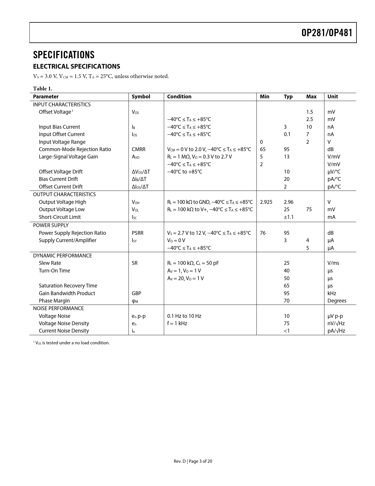 OP281/OP481. SPECIFICATIONS ELECTRICAL SPECIFICATIONS. Table 1. Parameter. Symbol. Condition. Min. Typ. Max. Unit