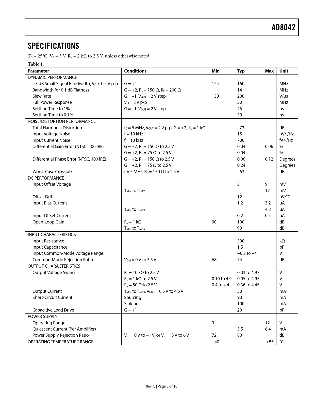 AD8042. SPECIFICATIONS. Table 1. Parameter. Conditions. Min. Typ. Max. Unit