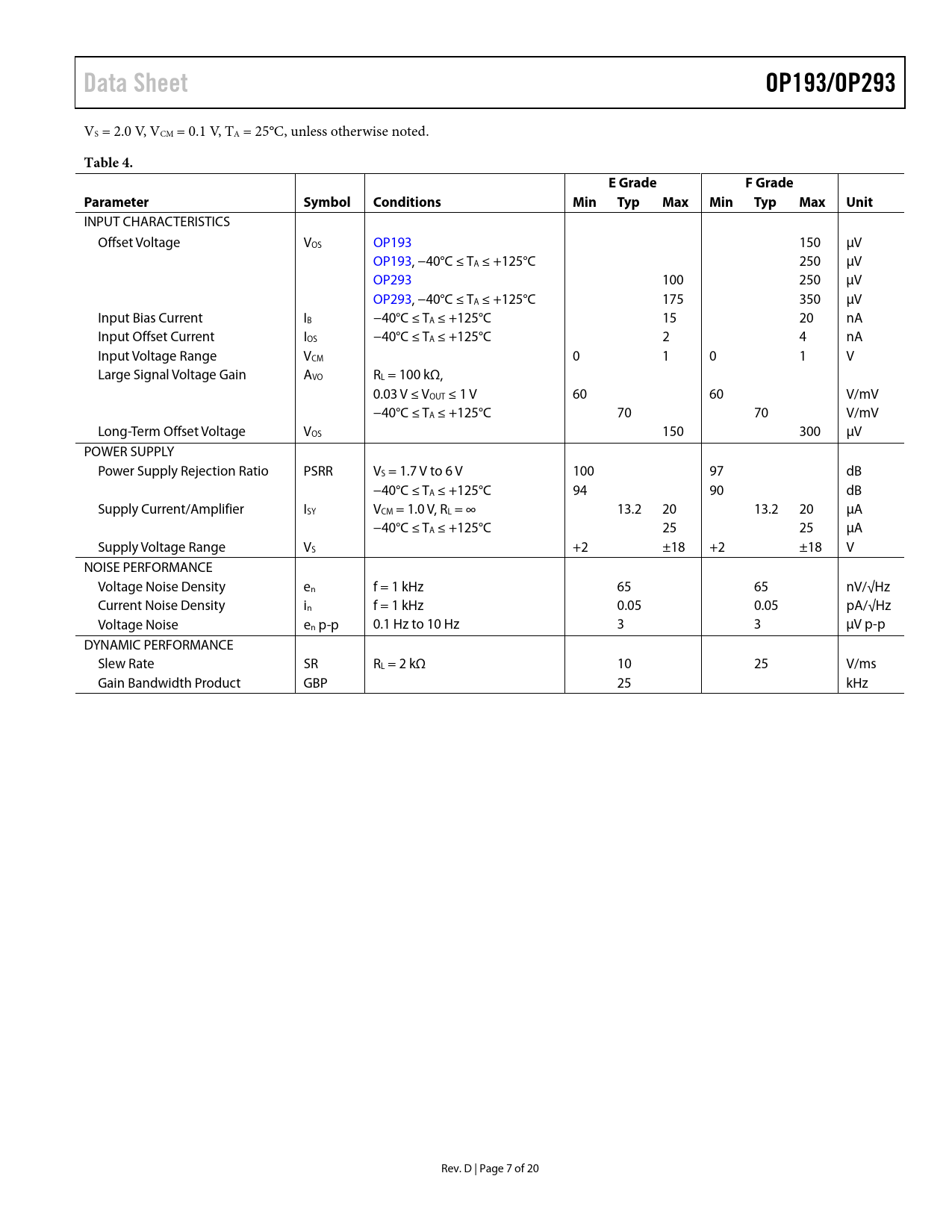 Data SheetOP193/OP293 VS = 2.0 V, VCM = 0.1 V, TA = 25°C, unless otherwise noted. Table 4.E GradeF GradeParameterSymbolConditionsMinTypMaxMinTypMaxUnit INPUT CHARACTERISTICS Offset Voltage VOS OP193 150 μV OP193, −40°C ≤ TA ≤ +125°C 250 μV OP293 100 250 μV OP293, −40°C ≤ TA ≤ +125°C 175 350 μV Input Bias Current IB −40°C ≤ TA ≤ +125°C 15 20 nA Input Offset Current IOS −40°C ≤ TA ≤ +125°C 2 4 nA Input Voltage Range VCM 0 1 0 1 V Large Signal Voltage Gain AVO RL = 100 kΩ, 0.03 V ≤ VOUT ≤ 1 V 60 60 V/mV −40°C ≤ TA ≤ +125°C 70 70 V/mV Long-Term Offset Voltage VOS 150 300 μV POWER SUPPLY Power Supply Rejection Ratio PSRR VS = 1.7 V to 6 V 100 97 dB −40°C ≤ TA ≤ +125°C 94 90 dB Supply Current/Amplifier ISY VCM = 1.0 V, RL = ∞ 13.2 20 13.2 20 μA −40°C ≤ TA ≤ +125°C 25 25 μA Supply Voltage Range VS +2 ±18 +2 ±18 V NOISE PERFORMANCE Voltage Noise Density en f = 1 kHz 65 65 nV/√Hz Current Noise Density in f = 1 kHz 0.05 0.05 pA/√Hz Voltage Noise en p-p 0.1 Hz to 10 Hz 3 3 μV p-p DYNAMIC PERFORMANCE Slew Rate SR RL = 2 kΩ 10 25 V/ms Gain Bandwidth Product GBP 25 kHz Rev. D | Page 7 of 20 Document Outline FEATURES APPLICATIONS GENERAL DESCRIPTION PIN CONFIGURATIONS TABLE OF CONTENTS REVISION HISTORY SPECIFICATIONS ELECTRICAL SPECIFICATIONS ABSOLUTE MAXIMUM RATINGS THERMAL RESISTANCE ESD CAUTION TYPICAL PERFORMANCE CHARACTERISTICS FUNCTIONAL DESCRIPTION DRIVING CAPACITIVE LOADS INPUT OVERVOLTAGE PROTECTION OUTPUT PHASE REVERSAL—OP193 OUTPUT PHASE REVERSAL—OP293 BATTERY-POWERED APPLICATIONS A MICROPOWER FALSE-GROUND GENERATOR A BATTERY-POWERED VOLTAGE REFERENCE A SINGLE-SUPPLY CURRENT MONITOR A SINGLE-SUPPLY INSTRUMENTATION AMPLIFIER A LOW POWER, TEMPERATURE TO 4 mA TO 20 mA TRANSMITTER A MICROPOWER VOLTAGE CONTROLLED OSCILLATOR OUTLINE DIMENSIONS ORDERING GUIDE