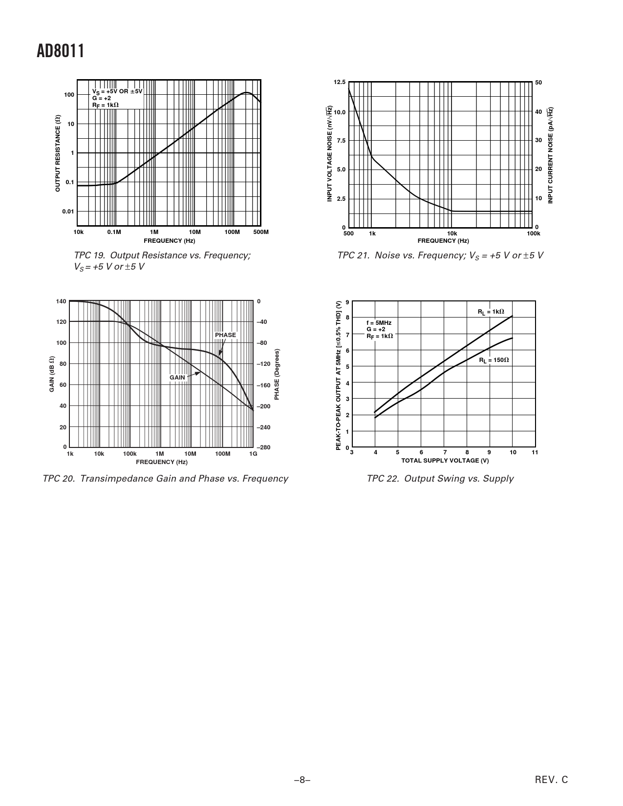 TPC 19. Output Resistance vs. Frequency; TPC 21. Noise vs. Frequency; VS = +5 V or ±5 V VS = +5 V or ±5 V