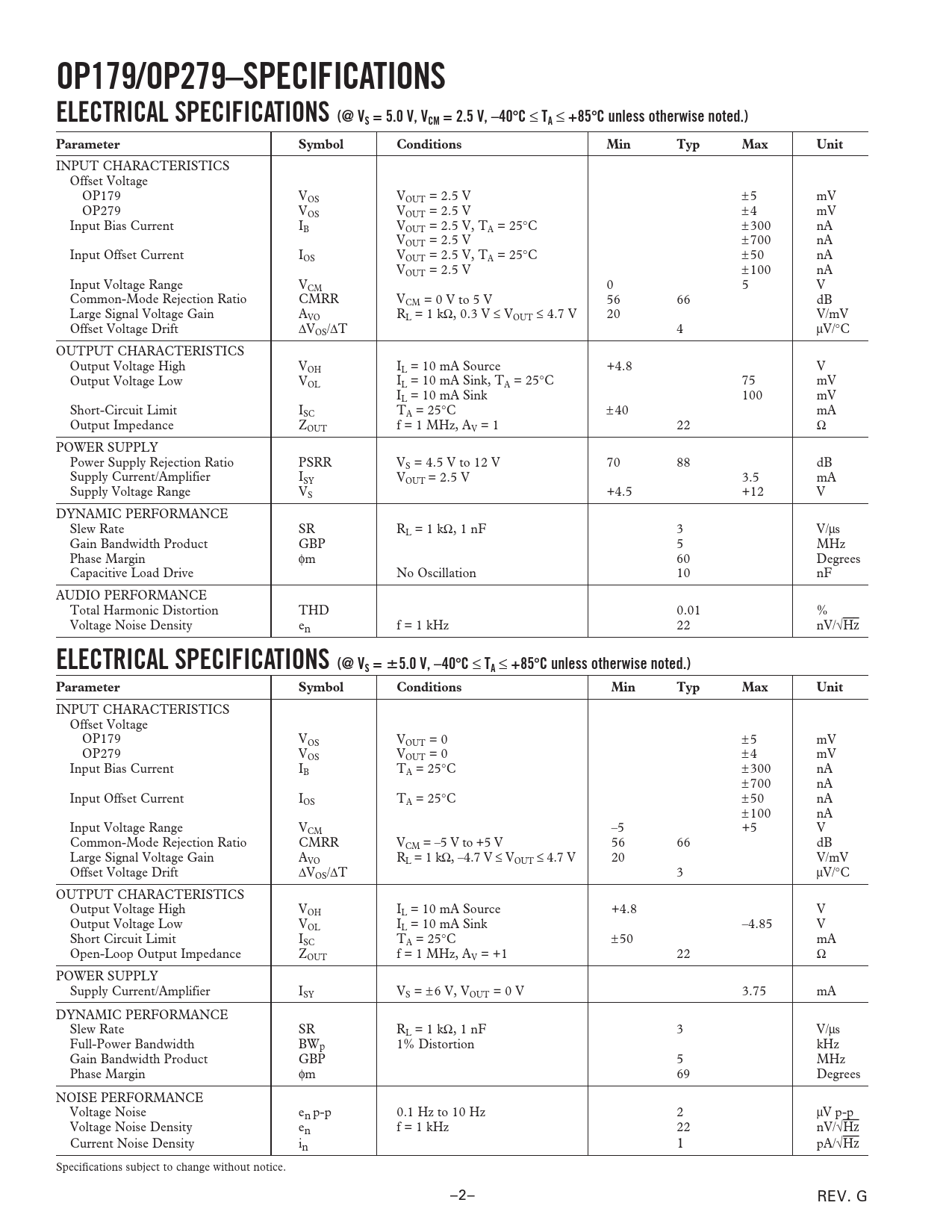 OP179/OP279–SPECIFICATIONS ELECTRICAL SPECIFICATIONS (@ VS = 5.0 V, VCM = 2.5 V, –40 ⴗ C ≤ TA ≤ +85 ⴗ C unless otherwise noted.) ParameterSymbolConditionsMinTypMaxUnit INPUT CHARACTERISTICS Offset Voltage OP179 VOS VOUT = 2.5 V ±5 mV OP279 VOS VOUT = 2.5 V ±4 mV Input Bias Current IB VOUT = 2.5 V, TA = 25°C ±300 nA VOUT = 2.5 V ±700 nA Input Offset Current IOS VOUT = 2.5 V, TA = 25°C ±50 nA VOUT = 2.5 V ±100 nA Input Voltage Range VCM 0 5 V Common-Mode Rejection Ratio CMRR VCM = 0 V to 5 V 56 66 dB Large Signal Voltage Gain AVO RL = 1 kΩ, 0.3 V ≤ VOUT ≤ 4.7 V 20 V/mV Offset Voltage Drift ∆VOS/∆T 4 µV/°C OUTPUT CHARACTERISTICS Output Voltage High VOH IL = 10 mA Source +4.8 V Output Voltage Low VOL IL = 10 mA Sink, TA = 25°C 75 mV IL = 10 mA Sink 100 mV Short-Circuit Limit ISC TA = 25°C ±40 mA Output Impedance ZOUT f = 1 MHz, AV = 1 22 Ω POWER SUPPLY Power Supply Rejection Ratio PSRR VS = 4.5 V to 12 V 70 88 dB Supply Current/Amplifier ISY VOUT = 2.5 V 3.5 mA Supply Voltage Range VS +4.5 +12 V DYNAMIC PERFORMANCE Slew Rate SR RL = 1 kΩ, 1 nF 3 V/µs Gain Bandwidth Product GBP 5 MHz Phase Margin φm 60 Degrees Capacitive Load Drive No Oscillation 10 nF AUDIO PERFORMANCE Total Harmonic Distortion THD 0.01 % Voltage Noise Density en f = 1 kHz 22 nV/√Hz ELECTRICAL SPECIFICATIONS (@ VS = ⴞ 5.0 V, –40 ⴗ C ≤ TA ≤ +85 ⴗ C unless otherwise noted.) ParameterSymbolConditionsMinTypMaxUnit INPUT CHARACTERISTICS Offset Voltage OP179 VOS VOUT = 0 ±5 mV OP279 VOS VOUT = 0 ±4 mV Input Bias Current IB TA = 25°C ±300 nA ±700 nA Input Offset Current IOS TA = 25°C ±50 nA ±100 nA Input Voltage Range VCM –5 +5 V Common-Mode Rejection Ratio CMRR VCM = –5 V to +5 V 56 66 dB Large Signal Voltage Gain AVO RL = 1 kΩ, –4.7 V ≤ VOUT ≤ 4.7 V 20 V/mV Offset Voltage Drift ∆VOS/∆T 3 µV/°C OUTPUT CHARACTERISTICS Output Voltage High VOH IL = 10 mA Source +4.8 V Output Voltage Low VOL IL = 10 mA Sink –4.85 V Short Circuit Limit ISC TA = 25°C ±50 mA Open-Loop Output Impedance ZOUT f = 1 MHz, AV = +1 22 Ω POWER SUPPLY Supply Current/Amplifier ISY VS = ± 6 V, VOUT = 0 V 3.75 mA DYNAMIC PERFORMANCE Slew Rate SR RL = 1 kΩ, 1 nF 3 V/µs Full-Power Bandwidth BWp 1% Distortion kHz Gain Bandwidth Product GBP 5 MHz Phase Margin φm 69 Degrees NOISE PERFORMANCE Voltage Noise en p-p 0.1 Hz to 10 Hz 2 µV p-p Voltage Noise Density en f = 1 kHz 22 nV/√Hz Current Noise Density in 1 pA/√Hz Specifications subject to change without notice. –2– REV. G