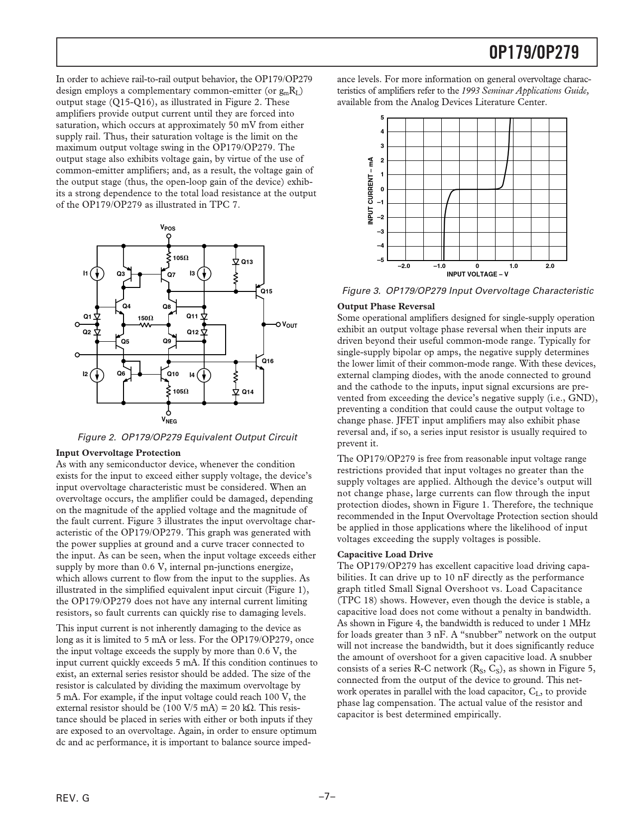 OP179/OP279 mA – INPUT CURRENT VPOS 105 Q13 –2.0 –1.0 1.0 2.0 INPUT VOLTAGE – V Q15 Output Phase Reversal Q11 150 VOUT Q12 Q16 Q10 Q14 VNEG