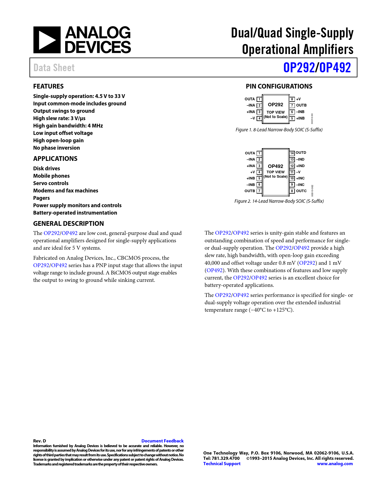 Datasheet OP292, OP492 (Analog Devices)
