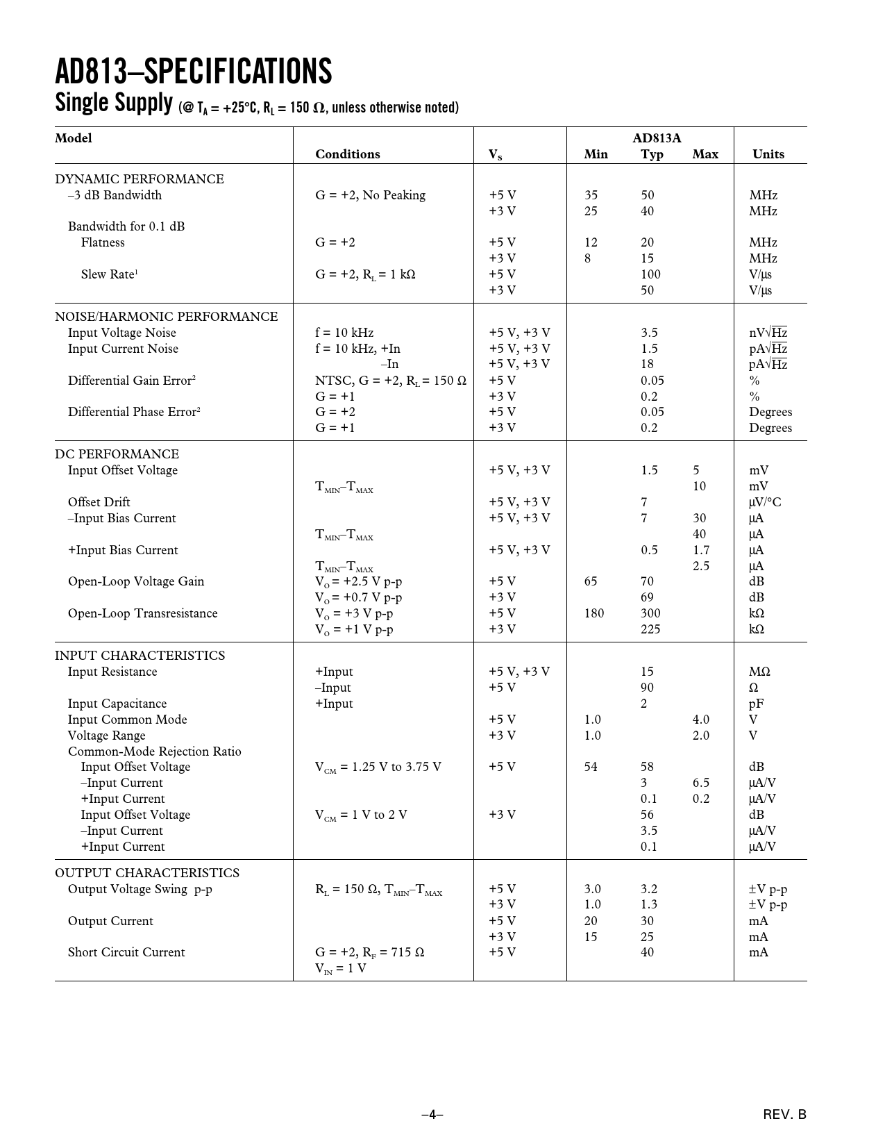 AD813–SPECIFICATIONS Single Supply (@ TA = +25 C, RL = 150 , unless otherwise noted) Model AD813A Conditions Min Typ Max Units