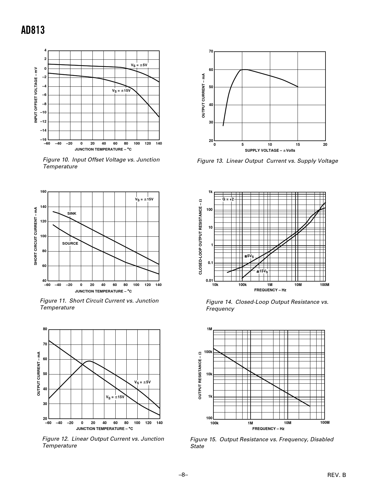 AD8134702VS = 6 5V060–2–450VS = 6 15V–6–840–10OUTPUT CURRENT – mAINPUT OFFSET VOLTAGE – mV –1230–14–1620–60–40–2002040608010012014005101520JUNCTION TEMPERATURE – CSUPPLY VOLTAGE – 6 Volts Figure 10. Input Offset Voltage vs. Junction Figure 13. Linear Output Current vs. Supply Voltage Temperature 1601kVS = 6 15V V G = +2140100SINK12010100SOURCE1805VS0.1SHORT CIRCUIT CURRENT – mA6015VCLOSED-LOOP OUTPUT RESISTANCE –S400.01–60–40–2002040608010012014010k100k1M10M100MFREQUENCY – HzJUNCTION TEMPERATURE – C Figure 11. Short Circuit Current vs. Junction Figure 14. Closed-Loop Output Resistance vs. Temperature Frequency 801M70100k V 605010kVS = 6 5V40OUTPUT CURRENT – mAV1kS = 6 15VOUTPUT RESISTANCE – Ω 3020100–60–40–20020406080100120140100k1M10M100MJUNCTION TEMPERATURE – CFREQUENCY – Hz Figure 12. Linear Output Current vs. Junction Figure 15. Output Resistance vs. Frequency, Disabled Temperature State –8– REV. B