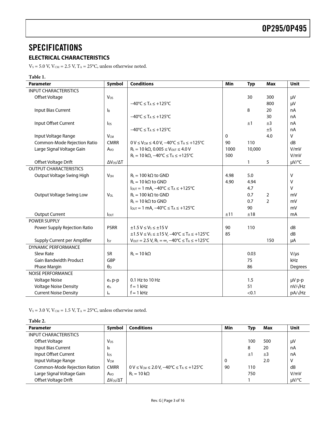 OP295/OP495SPECIFICATIONS ELECTRICAL CHARACTERISTICS VS = 5.0 V, VCM = 2.5 V, TA = 25°C, unless otherwise noted. Table 1. Parameter SymbolConditionsMinTypMaxUnit INPUT CHARACTERISTICS Offset Voltage VOS 30 300 μV −40°C ≤ TA ≤ +125°C 800 μV Input Bias Current IB 8 20 nA −40°C ≤ TA ≤ +125°C 30 nA Input Offset Current IOS ±1 ±3 nA −40°C ≤ TA ≤ +125°C ±5 nA Input Voltage Range VCM 0 4.0 V Common-Mode Rejection Ratio CMRR 0 V ≤ VCM ≤ 4.0 V, −40°C ≤ TA ≤ +125°C 90 110 dB Large Signal Voltage Gain AVO RL = 10 kΩ, 0.005 ≤ VOUT ≤ 4.0 V 1000 10,000 V/mV RL = 10 kΩ, −40°C ≤ TA ≤ +125°C 500 V/mV Offset Voltage Drift ΔVOS/ΔT 1 5 μV/°C OUTPUT CHARACTERISTICS Output Voltage Swing High VOH RL = 100 kΩ to GND 4.98 5.0 V RL = 10 kΩ to GND 4.90 4.94 V IOUT = 1 mA, −40°C ≤ TA ≤ +125°C 4.7 V Output Voltage Swing Low VOL RL = 100 kΩ to GND 0.7 2 mV RL = 10 kΩ to GND 0.7 2 mV IOUT = 1 mA, −40°C ≤ TA ≤ +125°C 90 mV Output Current IOUT ±11 ±18 mA POWER SUPPLY Power Supply Rejection Ratio PSRR ±1.5 V ≤ VS ≤ ±15 V 90 110 dB ±1.5 V ≤ VS ≤ ±15 V, –40°C ≤ TA ≤ +125°C 85 dB Supply Current per Amplifier ISY VOUT = 2.5 V, RL = ∞, −40°C ≤ TA ≤ +125°C 150 μA DYNAMIC PERFORMANCE Slew Rate SR RL = 10 kΩ 0.03 V/μs Gain Bandwidth Product GBP 75 kHz Phase Margin θO 86 Degrees NOISE PERFORMANCE Voltage Noise en p-p 0.1 Hz to 10 Hz 1.5 μV p-p Voltage Noise Density en f = 1 kHz 51 nV/√Hz Current Noise Density in f = 1 kHz <0.1 pA/√Hz VS = 3.0 V, VCM = 1.5 V, TA = 25°C, unless otherwise noted. Table 2. Parameter SymbolConditionsMinTypMaxUnit INPUT CHARACTERISTICS Offset Voltage VOS 100 500 μV Input Bias Current IB 8 20 nA Input Offset Current IOS ±1 ±3 nA Input Voltage Range VCM 0 2.0 V Common-Mode Rejection Ration CMRR 0 V ≤ VCM ≤ 2.0 V, −40°C ≤ TA ≤ +125°C 90 110 dB Large Signal Voltage Gain AVO RL = 10 kΩ 750 V/mV Offset Voltage Drift ∆VOS/∆T 1 μV/°C Rev. G | Page 3 of 16 Document Outline FEATURES APPLICATIONS GENERAL DESCRIPTION PIN CONFIGURATIONS TABLE OF CONTENTS REVISION HISTORY SPECIFICATIONS ELECTRICAL CHARACTERISTICS ABSOLUTE MAXIMUM RATINGS THERMAL RESISTANCE ESD CAUTION TYPICAL PERFORMANCE CHARACTERISTICS APPLICATIONS RAIL-TO-RAIL APPLICATION INFORMATION LOW DROP-OUT REFERENCE LOW NOISE, SINGLE-SUPPLY PREAMPLIFIER DRIVING HEAVY LOADS DIRECT ACCESS ARRANGEMENT SINGLE-SUPPLY INSTRUMENTATION AMPLIFIER SINGLE-SUPPLY RTD THERMOMETER AMPLIFIER COLD JUNCTION COMPENSATED, BATTERY-POWERED THERMOCOUPLE AMPLIFIER 5 V ONLY, 12-BIT DAC THAT SWINGS 0 V TO 4.095 V 4 mA TO 20 mA CURRENT-LOOP TRANSMITTER 3 V LOW DROPOUT LINEAR VOLTAGE REGULATOR LOW DROPOUT, 500 mA VOLTAGE REGULATOR WITH FOLDBACK CURRENT LIMITING SQUARE WAVE OSCILLATOR SINGLE-SUPPLY DIFFERENTIAL SPEAKER DRIVER HIGH ACCURACY, SINGLE-SUPPLY, LOW POWER COMPARATOR OUTLINE DIMENSIONS ORDERING GUIDE