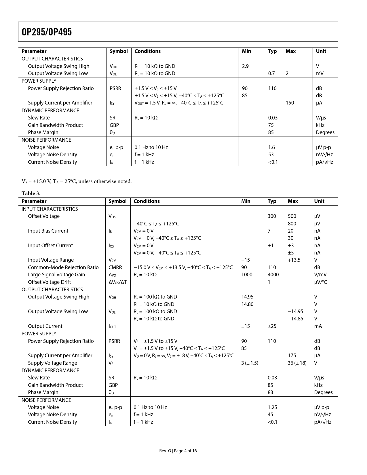 OP295/OP495 Parameter Symbol Conditions Min Typ Max Unit Table 3 Parameter Symbol