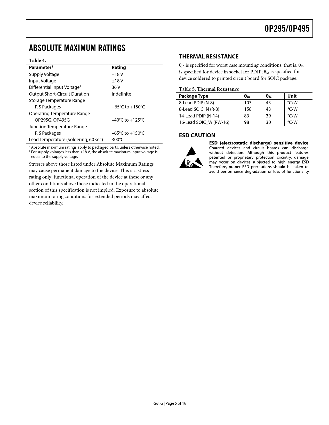 link to page 5 link to page 5 OP295/OP495ABSOLUTE MAXIMUM RATINGSTHERMAL RESISTANCETable 4. θ Parameter1Rating JA is specified for worst case mounting conditions; that is, θJA is specified for device in socket for PDIP; θ Supply Voltage ±18 V JA is specified for device soldered to printed circuit board for SOIC package. Input Voltage ±18 V Differential Input Voltage2 36 V Table 5. Thermal Resistance Output Short-Circuit Duration Indefinite Package TypeθJAθJC Unit Storage Temperature Range 8-Lead PDIP (N-8) 103 43 °C/W P, S Packages −65°C to +150°C 8-Lead SOIC_N (R-8) 158 43 °C/W Operating Temperature Range 14-Lead PDIP (N-14) 83 39 °C/W OP295G, OP495G –40°C to +125°C 16-Lead SOIC_W (RW-16) 98 30 °C/W Junction Temperature Range P, S Packages –65°C to +150°C ESD CAUTION Lead Temperature (Soldering, 60 sec) 300°C 1 Absolute maximum ratings apply to packaged parts, unless otherwise noted. 2 For supply voltages less than ±18 V, the absolute maximum input voltage is equal to the supply voltage. Stresses above those listed under Absolute Maximum Ratings may cause permanent damage to the device. This is a stress rating only; functional operation of the device at these or any other conditions above those indicated in the operational section of this specification is not implied. Exposure to absolute maximum rating conditions for extended periods may affect device reliability. Rev. G | Page 5 of 16 Document Outline FEATURES APPLICATIONS GENERAL DESCRIPTION PIN CONFIGURATIONS TABLE OF CONTENTS REVISION HISTORY SPECIFICATIONS ELECTRICAL CHARACTERISTICS ABSOLUTE MAXIMUM RATINGS THERMAL RESISTANCE ESD CAUTION TYPICAL PERFORMANCE CHARACTERISTICS APPLICATIONS RAIL-TO-RAIL APPLICATION INFORMATION LOW DROP-OUT REFERENCE LOW NOISE, SINGLE-SUPPLY PREAMPLIFIER DRIVING HEAVY LOADS DIRECT ACCESS ARRANGEMENT SINGLE-SUPPLY INSTRUMENTATION AMPLIFIER SINGLE-SUPPLY RTD THERMOMETER AMPLIFIER COLD JUNCTION COMPENSATED, BATTERY-POWERED THERMOCOUPLE AMPLIFIER 5 V ONLY, 12-BIT DAC THAT SWINGS 0 V TO 4.095 V 4 mA TO 20 mA CURRENT-LOOP TRANSMITTER 3 V LOW DROPOUT LINEAR VOLTAGE REGULATOR LOW DROPOUT, 500 mA VOLTAGE REGULATOR WITH FOLDBACK CURRENT LIMITING SQUARE WAVE OSCILLATOR SINGLE-SUPPLY DIFFERENTIAL SPEAKER DRIVER HIGH ACCURACY, SINGLE-SUPPLY, LOW POWER COMPARATOR OUTLINE DIMENSIONS ORDERING GUIDE