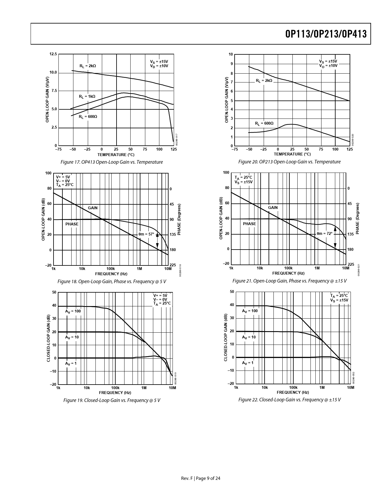028 00 0 Figure 18. Open-Loop Gain, Phase vs. Frequency @ 5 V Figure 21. Open-Loop Gain, Phase vs. Frequency @ ±15 V