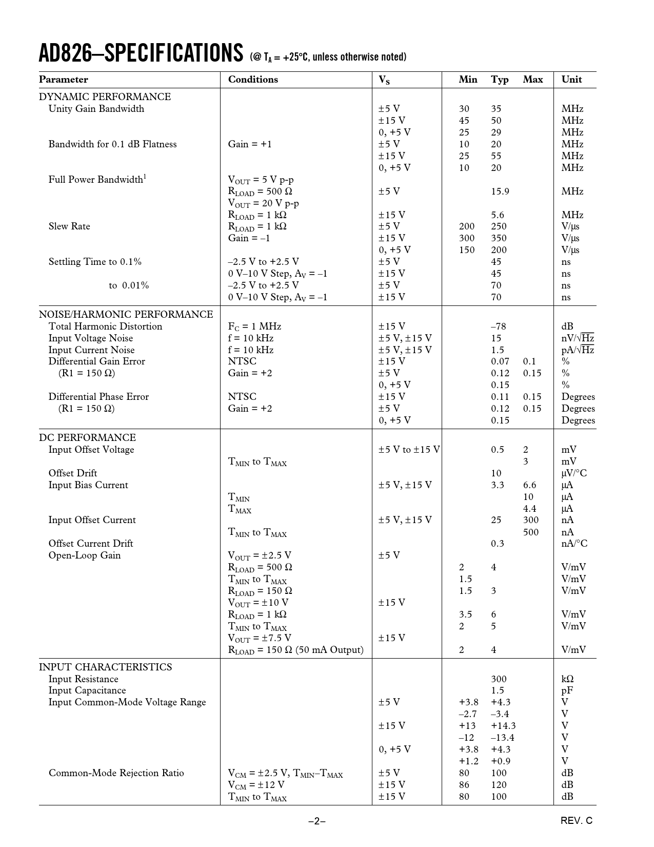 AD826–SPECIFICATIONS (@ TA = +25 C, unless otherwise noted) Parameter Conditions Min Typ Max Unit
