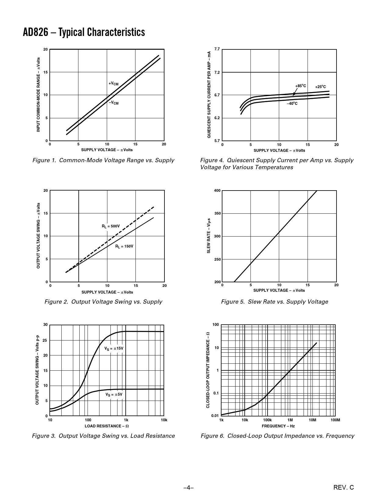 30 100 25 V 10 Volts p-p S = 15V 20 15 1 10 V 0.1 S = 5V 5 OUTPUT VOLTAGE SWING CLOSED-LOOP OUTPUT IMPEDANCE 0 0.01 10 100 1k 10k 1k 10k 100k 1M 10M 100M LOAD RESISTANCE – FREQUENCY – Hz