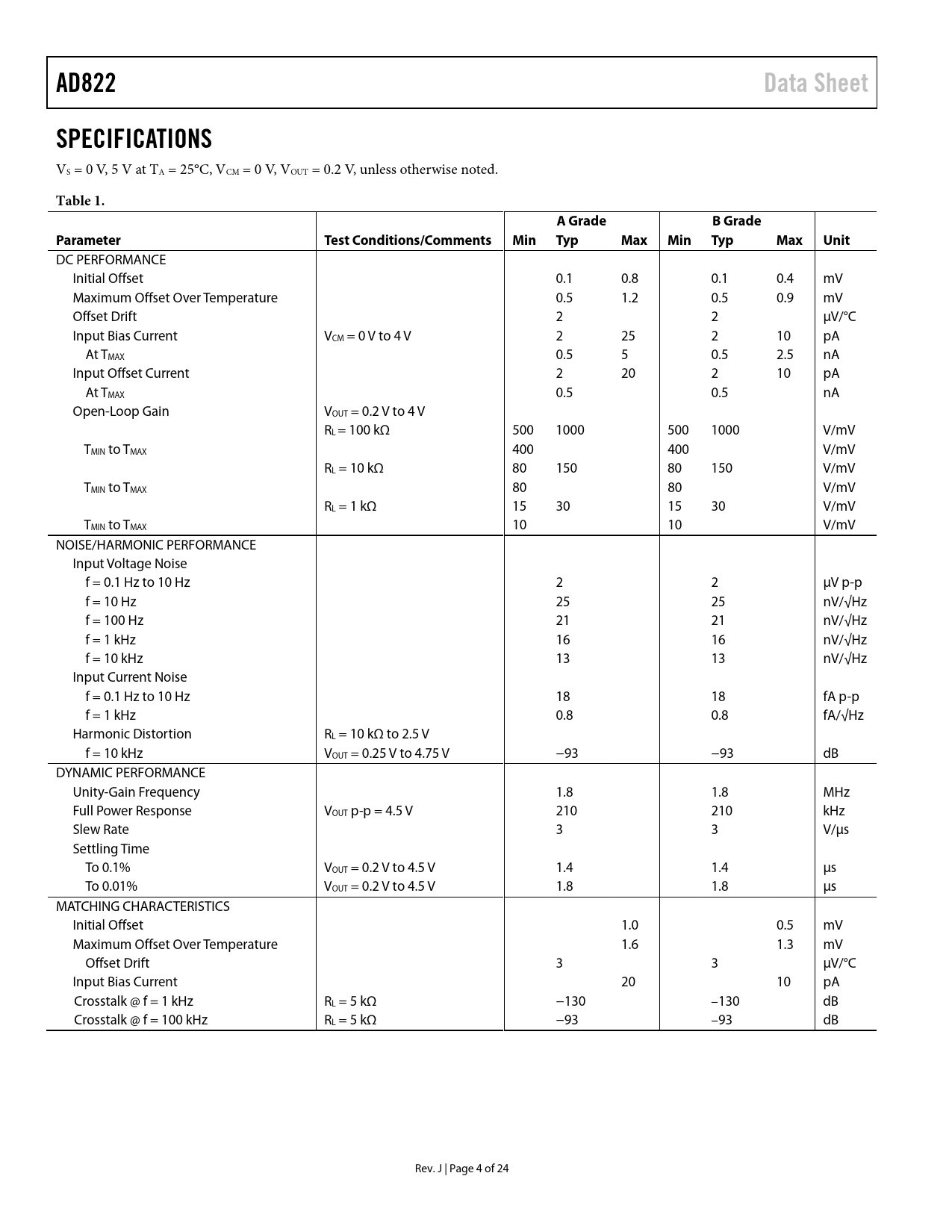 AD822. Data Sheet. SPECIFICATIONS. Table 1. A Grade. B Grade. Parameter. Test Conditions/Comments. Min. Typ. Max. Unit
