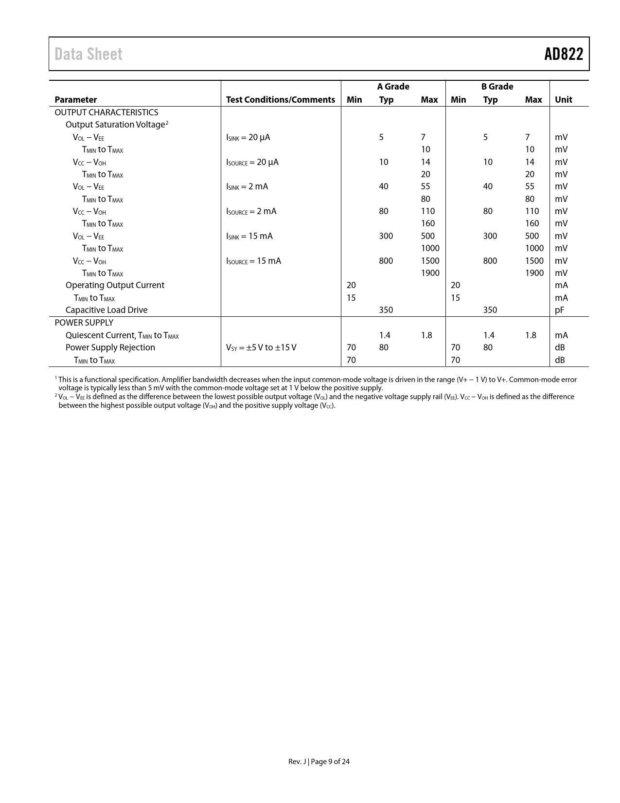 Data Sheet AD822 A Grade B Grade Parameter Test Conditions/Comments Min Typ Max Min Typ Max Unit