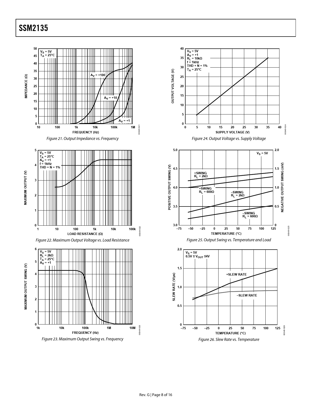 SSM2135. VS = 5V. 45 TA = 25°C. AV = +1. 35 RL = 10kΩ. f = 1kHz. 30 THD + N = 1%. TA = 25°C. AV = +100. AG T L. DANCE. E P. UT P. AV = +10. UT O. 100