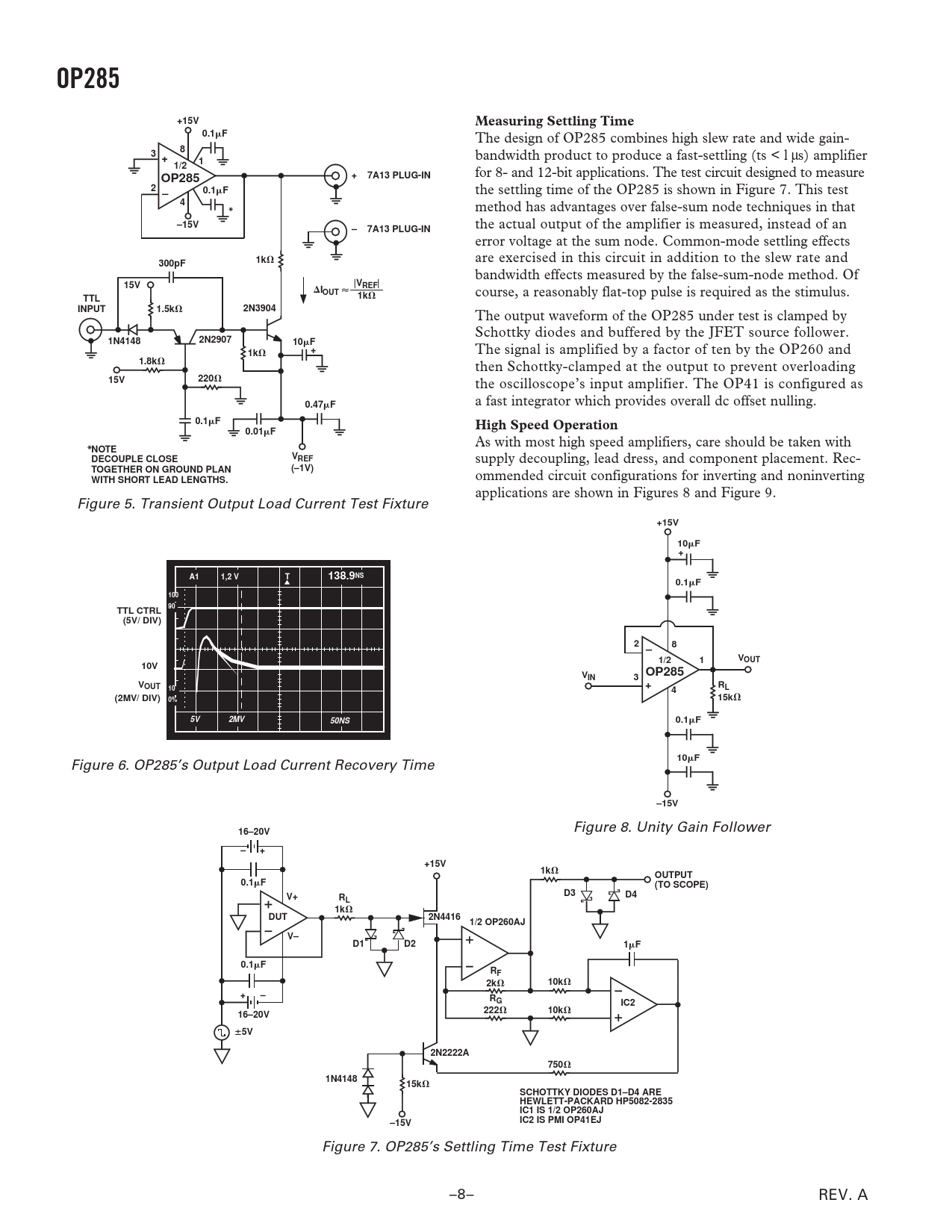 OP285+15VMeasuring Settling Time0.1F The design of OP285 combines high slew rate and wide gain- 38+ bandwidth product to produce a fast-settling (ts < l µs) amplifier 11/2+ 7A13 PLUG-INOP285 for 8- and 12-bit applications. The test circuit designed to measure 20.1F– the settling time of the OP285 is shown in Figure 7. This test 4 method has advantages over false-sum node techniques in that *–15V the actual output of the amplifier is measured, instead of an – 7A13 PLUG-IN error voltage at the sum node. Common-mode settling effects are exercised in this circuit in addition to the slew rate and 300pF1k bandwidth effects measured by the false-sum-node method. Of 15V|VIREF|OUT course, a reasonably flat-top pulse is required as the stimulus. TTL1kINPUT1.5k2N3904 The output waveform of the OP285 under test is clamped by Schottky diodes and buffered by the JFET source follower. 1N41482N290710F+1k The signal is amplified by a factor of ten by the OP260 and 1.8k then Schottky-clamped at the output to prevent overloading 15V220 the oscilloscope’s input amplifier. The OP41 is configured as 0.47F a fast integrator which provides overall dc offset nulling. 0.1FHigh Speed Operation0.01F As with most high speed amplifiers, care should be taken with *NOTEVDECOUPLE CLOSEREF supply decoupling, lead dress, and component placement. Rec- TOGETHER ON GROUND PLAN(–1V)WITH SHORT LEAD LENGTHS. ommended circuit configurations for inverting and noninverting applications are shown in Figures 8 and Figure 9. Figure 5. Transient Output Load Current Test Fixture +15V10F+A1 1,2 V T 138.9NS0.1F10090TTL CTRL(5V/ DIV)2 –81/21VOUT10VVOP285IN3 +VOUTR104L(2MV/ DIV) 0%15k5V2MV50NS0.1F10F Figure 6. OP285’s Output Load Current Recovery Time –15V Figure 8. Unity Gain Follower 16–20V–++15V1kOUTPUT0.1F(TO SCOPE)V+D3D4RL1kDUT2N44161/2 OP260AJV–D1D21F0.1FRF2k10k+–RGIC216–20V22210k5V2N2222A7501N414815kSCHOTTKY DIODES D1–D4 ARE HEWLETT-PACKARD HP5082-2835 IC1 IS 1/2 OP260AJ–15VIC2 IS PMI OP41EJ Figure 7. OP285’s Settling Time Test Fixture –8– REV. A