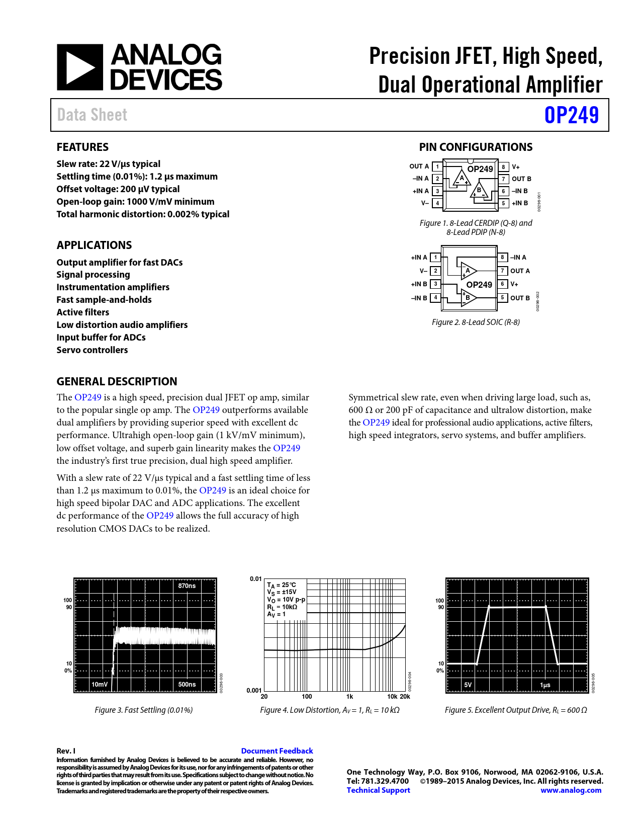 Precision JFET, High Speed,. Dual Operational Amplifier. Data Sheet. OP249. FEATURES. PIN CONFIGURATIONS