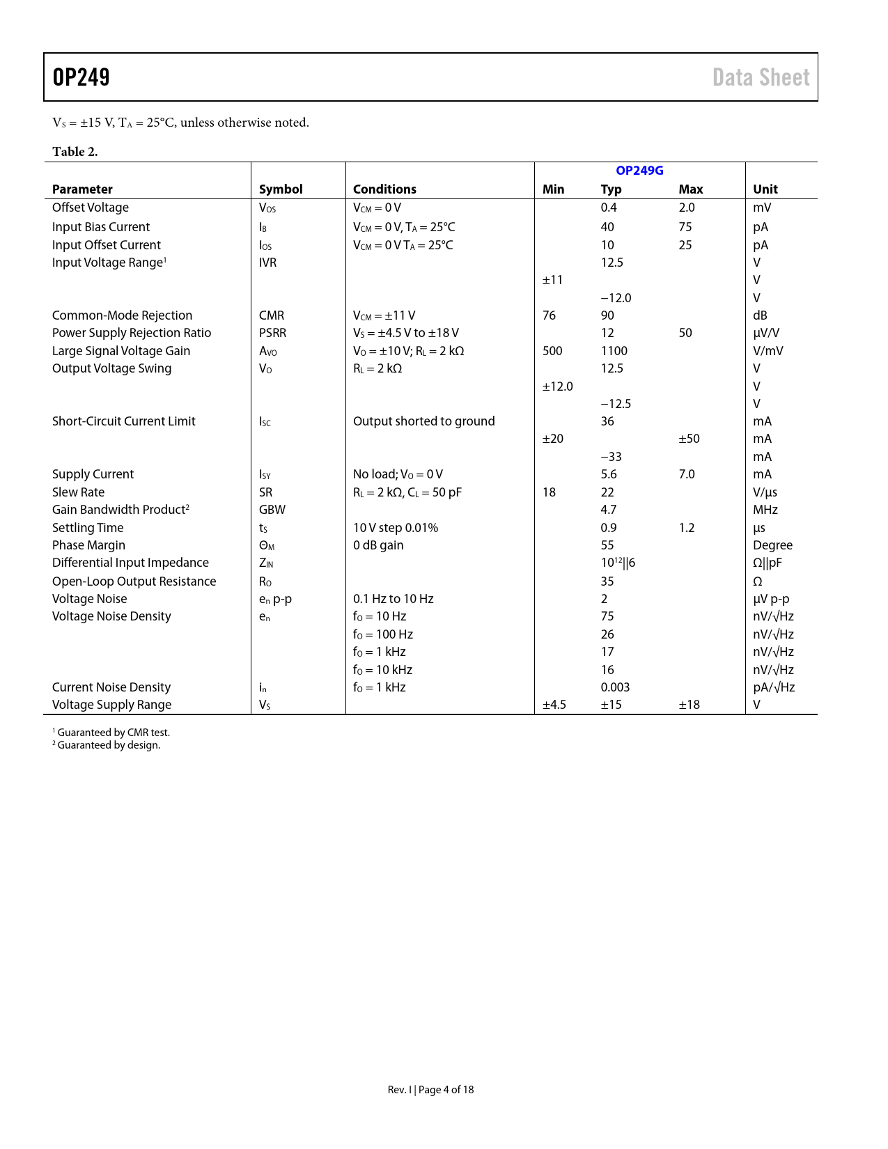 OP249 Data Sheet Table 2 OP249G Parameter Symbol Conditions Min Typ Max Unit