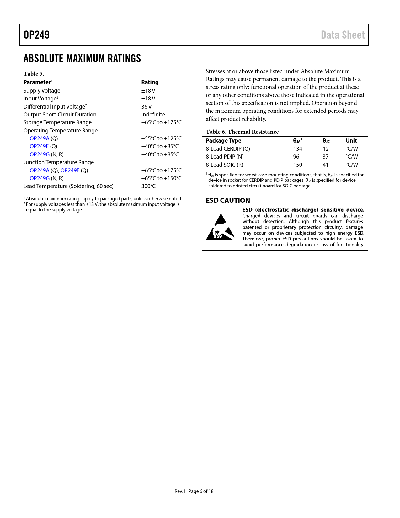 OP249 Data Sheet ABSOLUTE MAXIMUM RATINGS Table 5 Parameter1 Rating Table 6 Thermal Resistance Package Type θ 1 θJC Unit