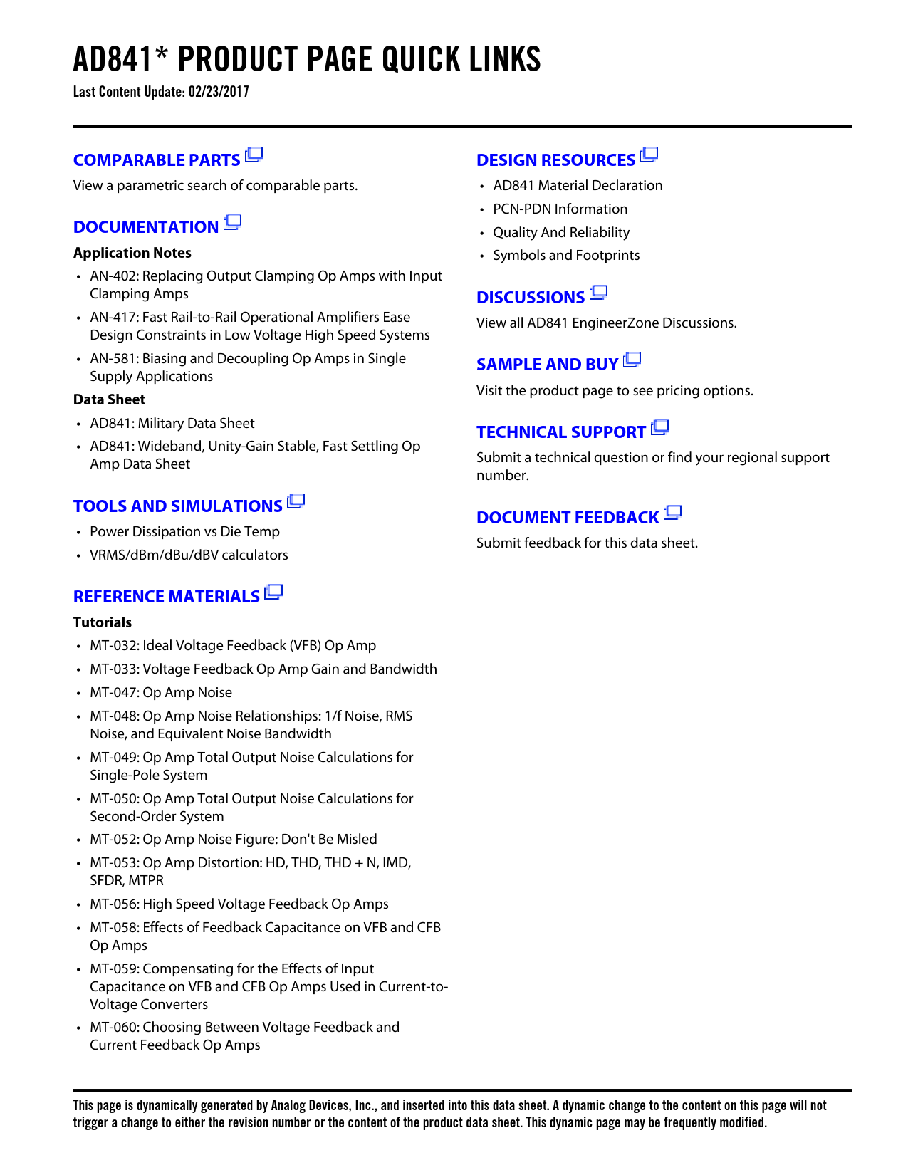 AD841* PRODUCT PAGE QUICK LINKS Last Content Update: 02/23/2017. COMPARABLE PARTS. DESIGN RESOURCES. DOCUMENTATION
