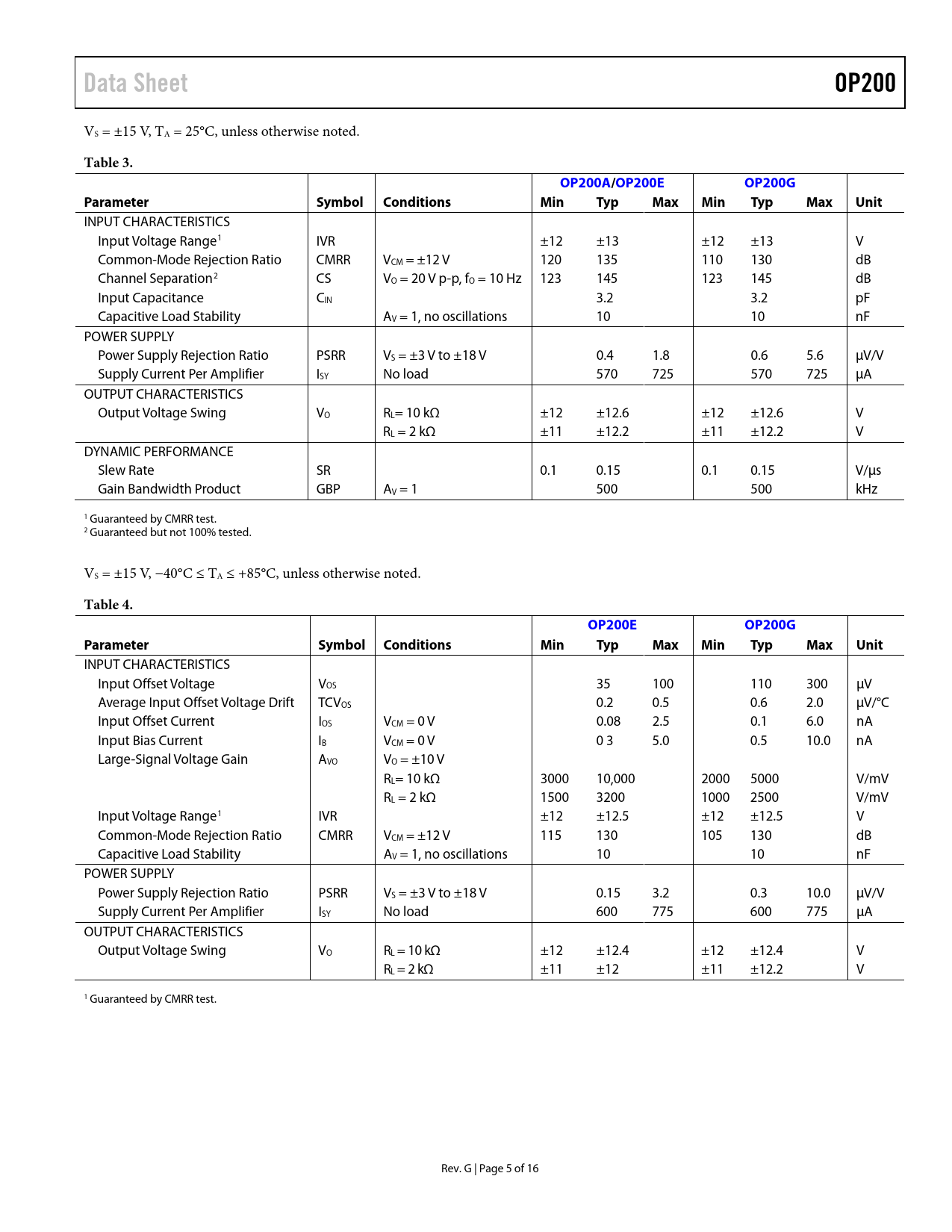 Data SheetOP200 VS = ±15 V, TA = 25°C, unless otherwise noted. Table 3.OP200A/OP200EOP200GParameterSymbolConditionsMinTypMaxMinTypMaxUnit INPUT CHARACTERISTICS Input Voltage Range1 IVR ±12 ±13 ±12 ±13 V Common-Mode Rejection Ratio CMRR VCM = ±12 V 120 135 110 130 dB Channel Separation2 CS VO = 20 V p-p, fO = 10 Hz 123 145 123 145 dB Input Capacitance CIN 3.2 3.2 pF Capacitive Load Stability AV = 1, no oscillations 10 10 nF POWER SUPPLY Power Supply Rejection Ratio PSRR VS = ±3 V to ±18 V 0.4 1.8 0.6 5.6 μV/V Supply Current Per Amplifier ISY No load 570 725 570 725 μA OUTPUT CHARACTERISTICS Output Voltage Swing VO RL= 10 kΩ ±12 ±12.6 ±12 ±12.6 V RL = 2 kΩ ±11 ±12.2 ±11 ±12.2 V DYNAMIC PERFORMANCE Slew Rate SR 0.1 0.15 0.1 0.15 V/μs Gain Bandwidth Product GBP AV = 1 500 500 kHz 1 Guaranteed by CMRR test. 2 Guaranteed but not 100% tested. VS = ±15 V, −40°C ≤ TA ≤ +85°C, unless otherwise noted. Table 4.OP200EOP200GParameterSymbol ConditionsMinTypMaxMinTypMaxUnit INPUT CHARACTERISTICS Input Offset Voltage VOS 35 100 110 300 μV Average Input Offset Voltage Drift TCVOS 0.2 0.5 0.6 2.0 μV/°C Input Offset Current IOS VCM = 0 V 0.08 2.5 0.1 6.0 nA Input Bias Current IB VCM = 0 V 0 3 5.0 0.5 10.0 nA Large-Signal Voltage Gain AVO VO = ±10 V RL= 10 kΩ 3000 10,000 2000 5000 V/mV RL = 2 kΩ 1500 3200 1000 2500 V/mV Input Voltage Range1 IVR ±12 ±12.5 ±12 ±12.5 V Common-Mode Rejection Ratio CMRR VCM = ±12 V 115 130 105 130 dB Capacitive Load Stability AV = 1, no oscillations 10 10 nF POWER SUPPLY Power Supply Rejection Ratio PSRR VS = ±3 V to ±18 V 0.15 3.2 0.3 10.0 μV/V Supply Current Per Amplifier ISY No load 600 775 600 775 μA OUTPUT CHARACTERISTICS Output Voltage Swing VO RL = 10 kΩ ±12 ±12.4 ±12 ±12.4 V RL = 2 kΩ ±11 ±12 ±11 ±12.2 V 1 Guaranteed by CMRR test. Rev. G | Page 5 of 16 Document Outline FEATURES PIN CONNECTIONS GENERAL DESCRIPTION REVISION HISTORY SPECIFICATIONS ELECTRICAL CHARACTERISTICS ABSOLUTE MAXIMUM RATINGS THERMAL RESISTANCE ESD CAUTION TYPICAL PERFORMANCE CHARACTERISTICS APPLICATIONS INFORMATION DUAL LOW POWER INSTRUMENTATION AMPLIFIER PRECISION ABSOLUTE VALUE AMPLIFIER PRECISION CURRENT PUMP DUAL 12-BIT VOLTAGE OUTPUT DAC DUAL PRECISION VOLTAGE REFERENCE PROGRAMMABLE HIGH RESOLUTION WINDOW COMPARATOR OUTLINE DIMENSIONS ORDERING GUIDE