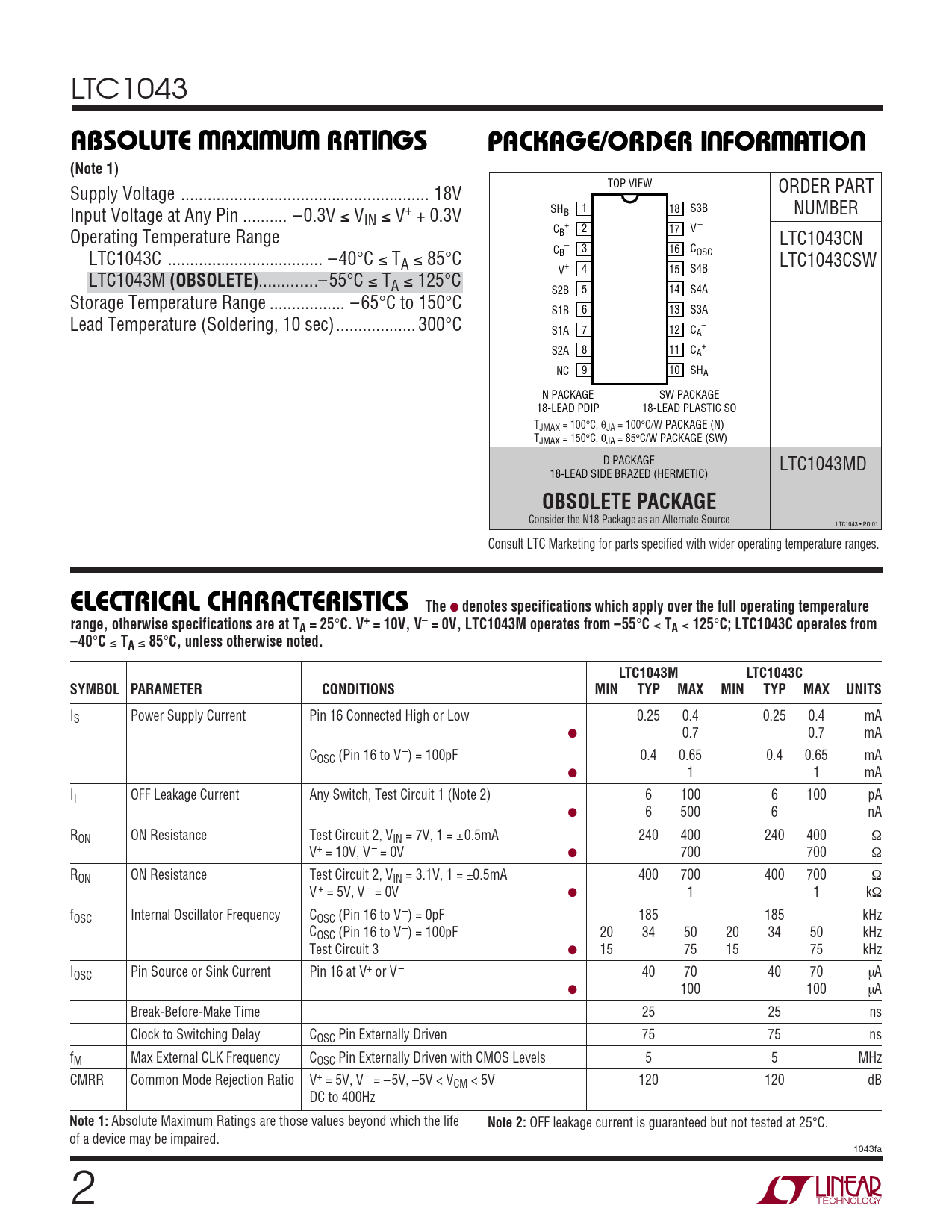 LTC1043 WWWUUWUABSOLUTE AXI U RATI GSPACKAGE/ORDER I FOR ATIO(Note 1) TOP VIEW Supply Voltage .. 18V ORDER PART Input Voltage at Any Pin .. – 0.3V ≤ V SH 1 18 B S3B NUMBER IN ≤ V+ + 0.3V C + 2 V – Operating Temperature Range 17 B LTC1043CN C – 3 16 C LTC1043C ... – 40°C ≤ T B OSC A ≤ 85°C LTC1043CSW V+ 4 15 S4B LTC1043M (OBSOLETE) ...– 55°C ≤ TA ≤ 125°C S2B 5 14 S4A Storage Temperature Range ... – 65°C to 150°C S1B 6 13 S3A Lead Temperature (Soldering, 10 sec).. 300°C S1A 7 12 C – A S2A 8 11 C + A NC 9 10 SHA N PACKAGE SW PACKAGE 18-LEAD PDIP 18-LEAD PLASTIC SO TJMAX = 100°C, θJA = 100°C/W PACKAGE (N) TJMAX = 150°C, θJA = 85°C/W PACKAGE (SW) D PACKAGE LTC1043MD 18-LEAD SIDE BRAZED (HERMETIC) OBSOLETE PACKAGE Consider the N18 Package as an Alternate Source LTC1043 • POI01 Consult LTC Marketing for parts specified with wider operating temperature ranges. ELECTRICAL CHARACTERISTICS The ● denotes specifications which apply over the full operating temperaturerange, otherwise specifications are at TA = 25 ° C. V+ = 10V, V– = 0V, LTC1043M operates from –55 ° C ≤ TA ≤ 125 ° C; LTC1043C operates from–40 ° C ≤ TA ≤ 85 ° C, unless otherwise noted.LTC1043MLTC1043CSYMBOL PARAMETERCONDITIONSMINTYPMAXMINTYPMAXUNITS IS Power Supply Current Pin 16 Connected High or Low 0.25 0.4 0.25 0.4 mA ● 0.7 0.7 mA COSC (Pin 16 to V–) = 100pF 0.4 0.65 0.4 0.65 mA ● 1 1 mA II OFF Leakage Current Any Switch, Test Circuit 1 (Note 2) 6 100 6 100 pA ● 6 500 6 nA RON ON Resistance Test Circuit 2, VIN = 7V, 1 = ±0.5mA 240 400 240 400 Ω V+ = 10V, V – = 0V ● 700 700 Ω RON ON Resistance Test Circuit 2, VIN = 3.1V, 1 = ±0.5mA 400 700 400 700 Ω V + = 5V, V – = 0V ● 1 1 kΩ fOSC Internal Oscillator Frequency COSC (Pin 16 to V–) = 0pF 185 185 kHz COSC (Pin 16 to V–) = 100pF 20 34 50 20 34 50 kHz Test Circuit 3 ● 15 75 15 75 kHz IOSC Pin Source or Sink Current Pin 16 at V+ or V – 40 70 40 70 µA ● 100 100 µA Break-Before-Make Time 25 25 ns Clock to Switching Delay COSC Pin Externally Driven 75 75 ns fM Max External CLK Frequency COSC Pin Externally Driven with CMOS Levels 5 5 MHz CMRR Common Mode Rejection Ratio V+ = 5V, V – = – 5V, –5V < VCM < 5V 120 120 dB DC to 400Hz Note 1: Absolute Maximum Ratings are those values beyond which the life Note 2: OFF leakage current is guaranteed but not tested at 25°C. of a device may be impaired. 1043fa 2
