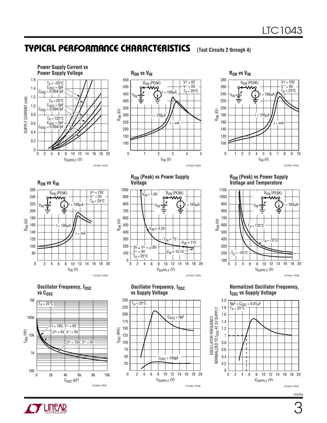 1.6 550 280 T R V+ = 5V R V+ = 10V A = –55°C ON (PEAK) ON (PEAK) V– = 0V V– = 0V 1.4 COSC = 0pF 500 260 C T T OSC = 0.0047pF A = 25°C A = 25°C 450 I = 100µA V 240 V I = 100µA 1.2 IN IN TA = 25°C 400 220 1.0 COSC = 0pF C ) 350 ) 200 OSC = 0.0047pF Ω Ω 0.8 ( 300 ( I = 100µA 180 I = 100µA T ON ON A = 125°C R R 0.6 COSC = 0pF 250 I = mA 160 I = mA COSC = 0.0047pF 200 140 SUPPLY CURRENT (mA) 0.4 150 120 0.2 100 100 0 0 2 4 6 8 10 12 14 16 18 20 0 1 2 3 4 5 0 1 2 3 4 5 6 7 8 9 10 VSUPPLY (V) VIN (V) VIN (V) LTC1043 • TPC01 LTC1043 • TPC02 LTC1043 • TPC03