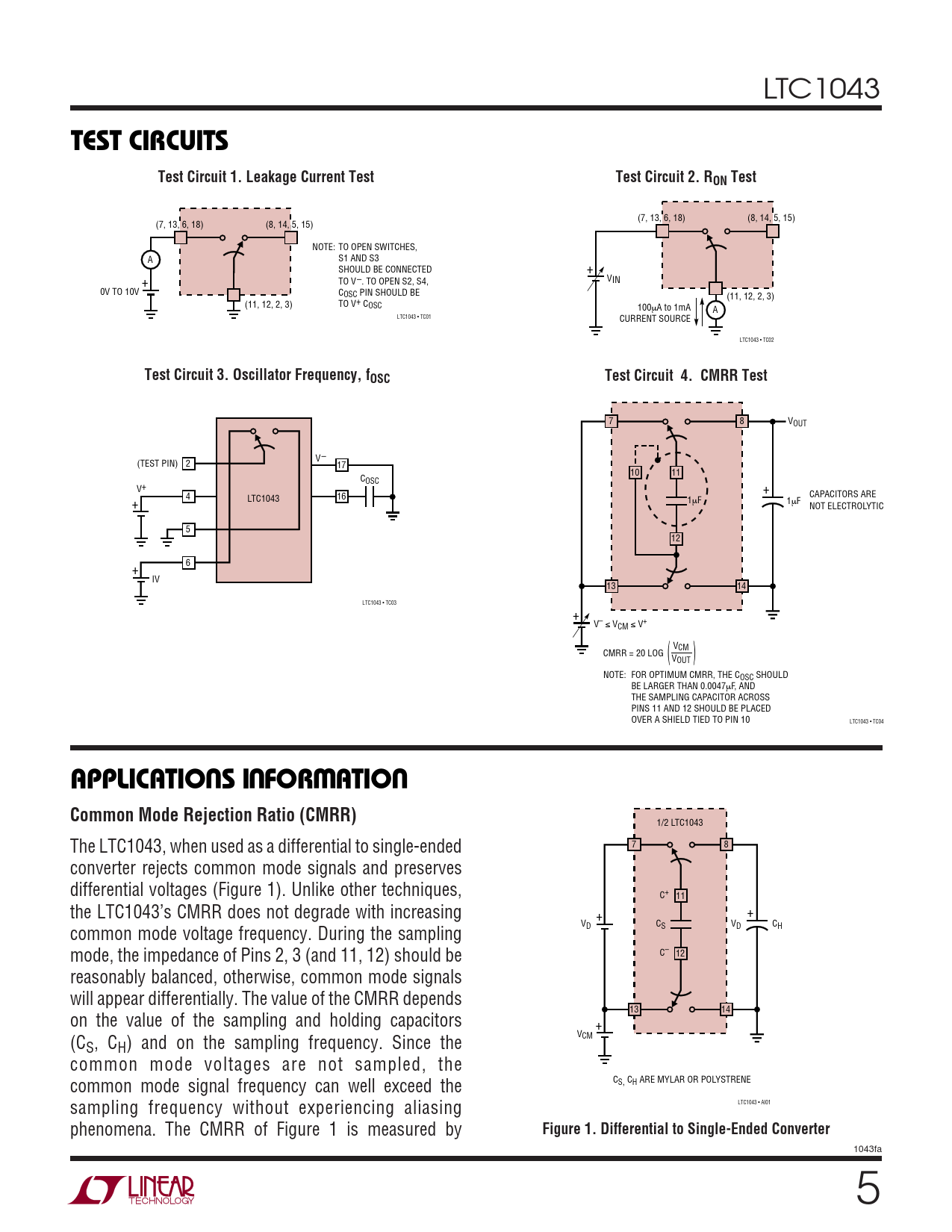 7 8 VOUT V– (TEST PIN) 2 17 10 11 COSC V+ + 4 16 CAPACITORS ARE + LTC1043 1µF 1µF NOT ELECTROLYTIC 5 12 6 + IV 13 14 LTC1043 • TC03 + V– ≤ VCM ≤ V+ VCM CMRR = 20 LOG ( VOUT ) NOTE: FOR OPTIMUM CMRR, THE COSC SHOULD BE LARGER THAN 0.0047µF, AND THE SAMPLING CAPACITOR ACROSS PINS 11 AND 12 SHOULD BE PLACED OVER A SHIELD TIED TO PIN 10 LTC1043 • TC04