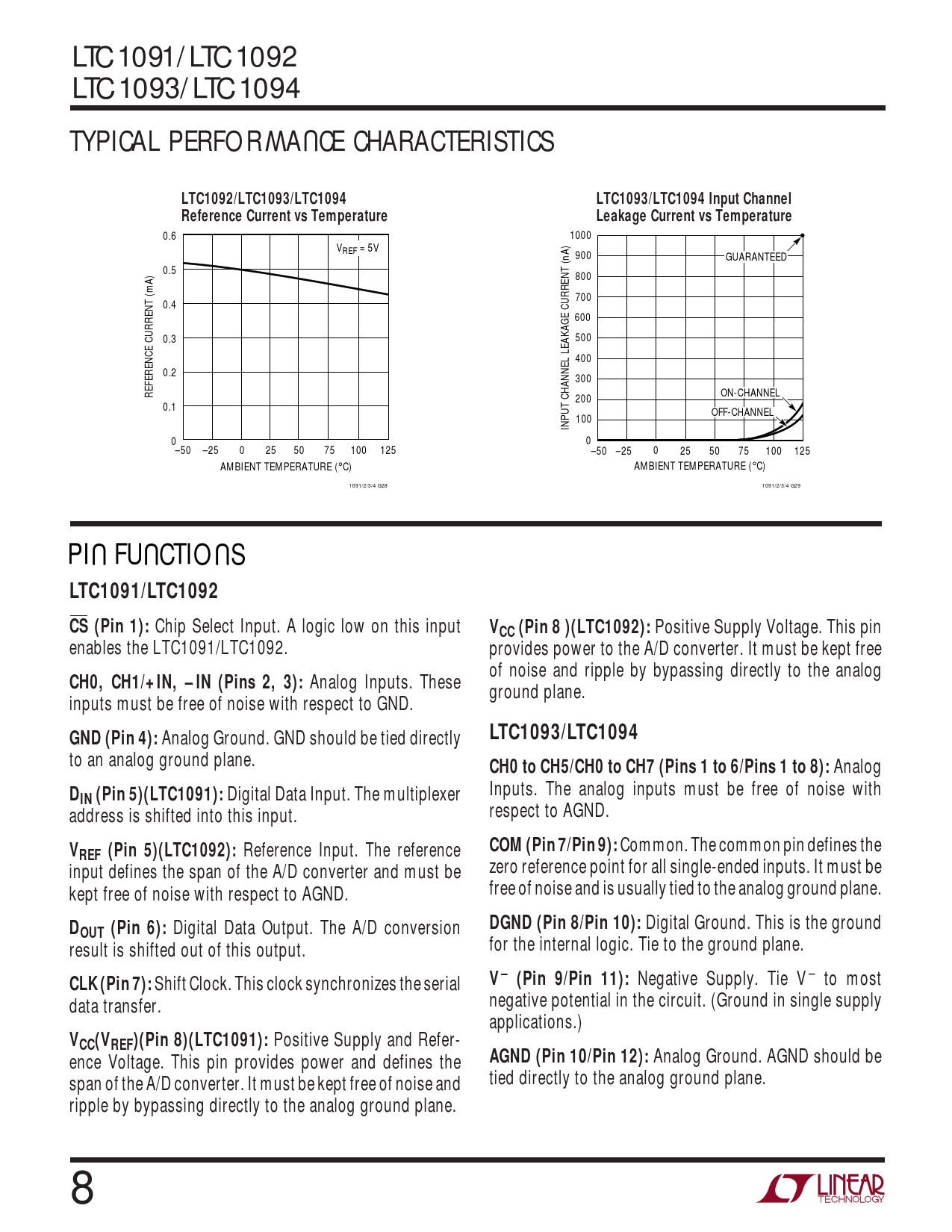 LTC1091/LTC1092 LTC1093/LTC1094 WUTYPICAL PERFOR A CE CHCARA TERISTICSLTC1092/LTC1093/LTC1094LTC1093/LTC1094 Input ChannelReference Current vs TemperatureLeakage Current vs Temperature 0.6 1000 VREF = 5V 900 GUARANTEED 0.5 800 700 0.4 600 0.3 500 400 0.2 300 REFERENCE CURRENT (mA) ON-CHANNEL 200 0.1 OFF-CHANNEL 100 INPUT CHANNEL LEAKAGE CURRENT (nA) 0 0 –50 –25 0 25 50 75 100 125 –50 –25 0 25 50 75 100 125 AMBIENT TEMPERATURE (°C) AMBIENT TEMPERATURE (°C) 1091/2/3/4 G28 1091/2/3/4 G29 UUUPI FU CTIO SLTC1091/LTC1092CS (Pin 1): Chip Select Input. A logic low on this input VCC (Pin 8 )(LTC1092): Positive Supply Voltage. This pin enables the LTC1091/LTC1092. provides power to the A/D converter. It must be kept free of noise and ripple by bypassing directly to the analog CH0, CH1/+ IN, – IN (Pins 2, 3): Analog Inputs. These ground plane. inputs must be free of noise with respect to GND. GND (Pin 4): Analog Ground. GND should be tied directly LTC1093/LTC1094 to an analog ground plane. CH0 to CH5/CH0 to CH7 (Pins 1 to 6/Pins 1 to 8): Analog D Inputs. The analog inputs must be free of noise with IN (Pin 5)(LTC1091): Digital Data Input. The multiplexer address is shifted into this input. respect to AGND. VCOM (Pin 7/Pin 9): Common. The common pin defines the REF (Pin 5)(LTC1092): Reference Input. The reference input defines the span of the A/D converter and must be zero reference point for all single-ended inputs. It must be kept free of noise with respect to AGND. free of noise and is usually tied to the analog ground plane. DDGND (Pin 8/Pin 10): Digital Ground. This is the ground OUT (Pin 6): Digital Data Output. The A/D conversion result is shifted out of this output. for the internal logic. Tie to the ground plane. CLK (Pin 7): Shift Clock. This clock synchronizes the serial V – (Pin 9/Pin 11): Negative Supply. Tie V – to most data transfer. negative potential in the circuit. (Ground in single supply applications.) VCC(VREF)(Pin 8)(LTC1091): Positive Supply and Refer- ence Voltage. This pin provides power and defines the AGND (Pin 10/Pin 12): Analog Ground. AGND should be span of the A/D converter. It must be kept free of noise and tied directly to the analog ground plane. ripple by bypassing directly to the analog ground plane. 8