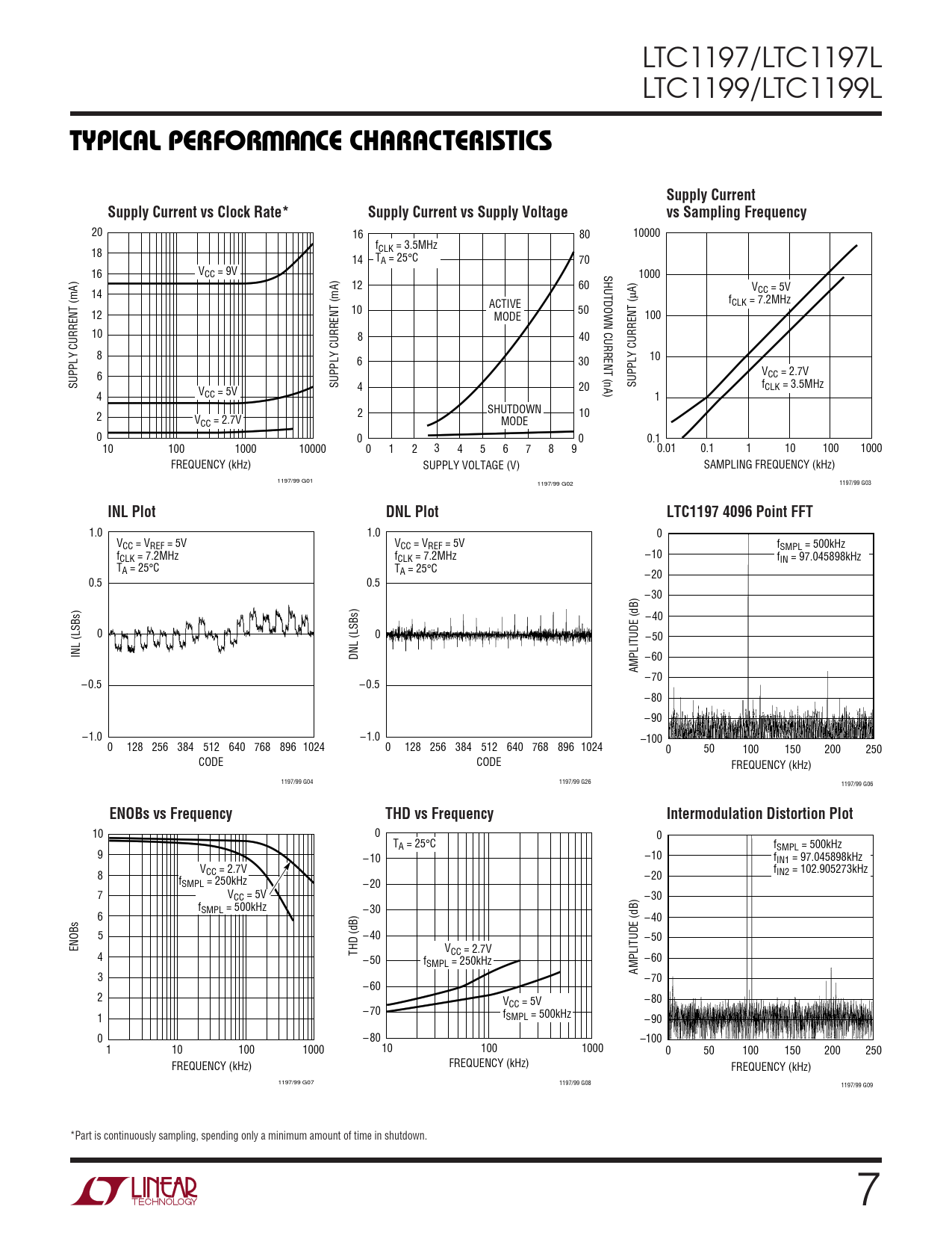20 16 80 10000 fCLK = 3.5MHz 18 14 TA = 25°C 70 16 VCC = 9V SHUTDOWN CURRENT (nA) 1000 12 60 V 14 µA) CC = 5V fCLK = 7.2MHz ACTIVE 12 10 50 MODE 100 10 8 40 8 10 6 30 6 VCC = 2.7V SUPPLY CURRENT (mA) SUPPLY CURRENT (mA) SUPPLY CURRENT ( f 4 20 CLK = 3.5MHz 4 VCC = 5V 1 SHUTDOWN 2 2 10 VCC = 2.7V MODE 0 0 0 0.1 10 100 1000 10000 0 1 2 3 4 5 6 7 8 9 0.01 0.1 1 10 100 1000 FREQUENCY (kHz) SUPPLY VOLTAGE (V) SAMPLING FREQUENCY (kHz) 1197/99 G01 1197/99 G02 1197/99 G03