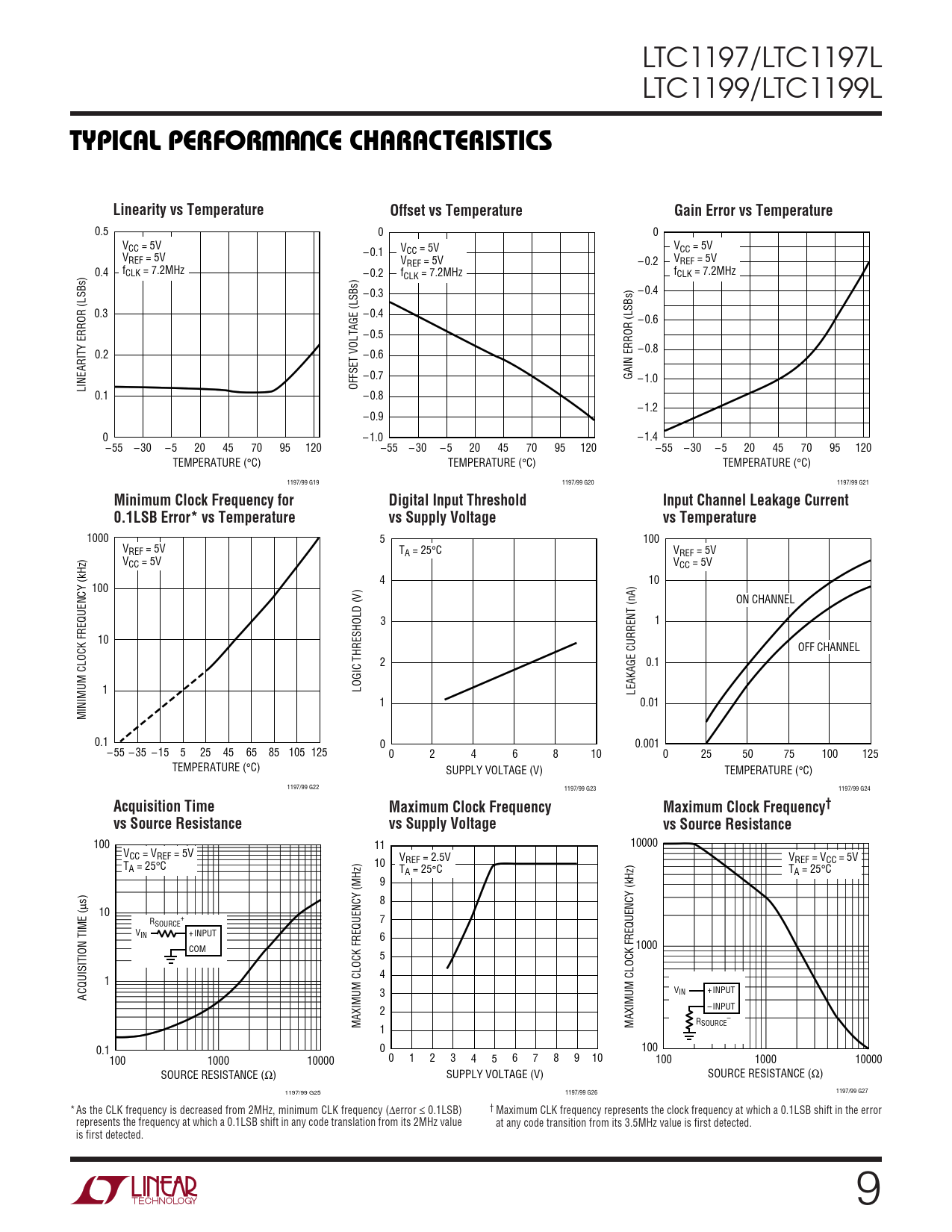 1000 5 100 VREF = 5V TA = 25°C VREF = 5V VCC = 5V VCC = 5V 4 10 100 ON CHANNEL 3 1 10 OFF CHANNEL 2 0.1 1 LOGIC THRESHOLD (V) LEAKAGE CURRENT (nA) 1 0.01 MINIMUM CLOCK FREQUENCY (kHz) 0.1 0 0.001 – 55 – 35 – 15 5 25 45 65 85 105 125 0 2 4 6 8 10 0 25 50 75 100 125 TEMPERATURE (°C) SUPPLY VOLTAGE (V) TEMPERATURE (°C) 1197/99 G22 1197/99 G23 1197/99 G24