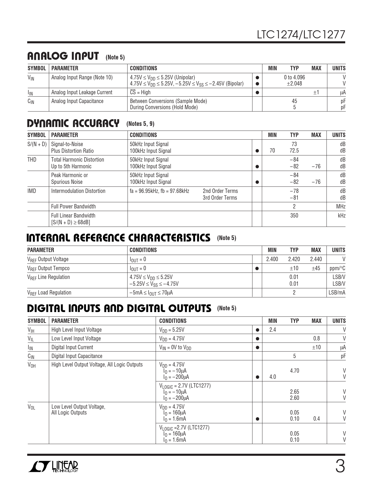 LTC1274/LTC1277 UUA ALOG I PUT (Note 5)SYMBOLPARAMETERCONDITIONSMINTYPMAXUNITS VIN Analog Input Range (Note 10) 4.75V ≤ VDD ≤ 5.25V (Unipolar) ● 0 to 4.096 V 4.75V ≤ VDD ≤ 5.25V, – 5.25V ≤ VSS ≤ – 2.45V (Bipolar) ● ±2.048 V IIN Analog Input Leakage Current CS = High ● ±1 µA CIN Analog Input Capacitance Between Conversions (Sample Mode) 45 pF During Conversions (Hold Mode) 5 pF UWDY A IC ACCURACY (Notes 5, 9)SYMBOLPARAMETERCONDITIONSMINTYPMAXUNITS S/(N + D) Signal-to-Noise 50kHz Input Signal 73 dB Plus Distortion Ratio 100kHz Input Signal ● 70 72.5 dB THD Total Harmonic Distortion 50kHz Input Signal – 84 dB Up to 5th Harmonic 100kHz Input Signal ● – 82 – 76 dB Peak Harmonic or 50kHz Input Signal – 84 dB Spurious Noise 100kHz Input Signal ● – 82 – 76 dB IMD Intermodulation Distortion fa = 96.95kHz, fb = 97.68kHz 2nd Order Terms – 78 dB 3rd Order Terms – 81 dB Full Power Bandwidth 2 MHz Full Linear Bandwidth 350 kHz [S/(N + D) ≥ 68dB] UUUI TER AL REFERE CE CHARACTERISTICS (Note 5)PARAMETERCONDITIONSMINTYPMAXUNITS VREF Output Voltage IOUT = 0 2.400 2.420 2.440 V VREF Output Tempco IOUT = 0 ● ±10 ±45 ppm/°C VREF Line Regulation 4.75V ≤ VDD ≤ 5.25V 0.01 LSB/V – 5.25V ≤ VSS ≤ – 4.75V 0.01 LSB/V VREF Load Regulation – 5mA ≤ IOUT ≤ 70µA 2 LSB/mA UU(Note 5)DIGITAL I PUTS A D DIGITAL OUTPUTSSYMBOLPARAMETERCONDITIONSMINTYPMAXUNITS VIH High Level Input Voltage VDD = 5.25V ● 2.4 V VIL Low Level Input Voltage VDD = 4.75V ● 0.8 V IIN Digital Input Current VIN = 0V to VDD ● ±10 µA CIN Digital Input Capacitance 5 pF VOH High Level Output Voltage, All Logic Outputs VDD = 4.75V IO = – 10µA 4.70 V IO = – 200µA ● 4.0 V VLOGIC = 2.7V (LTC1277) IO = – 10µA 2.65 V IO = – 200µA 2.60 V VOL Low Level Output Voltage, VDD = 4.75V All Logic Outputs IO = 160µA 0.05 V IO = 1.6mA ● 0.10 0.4 V VLOGIC =2.7V (LTC1277) IO = 160µA 0.05 V IO = 1.6mA 0.10 V 3
