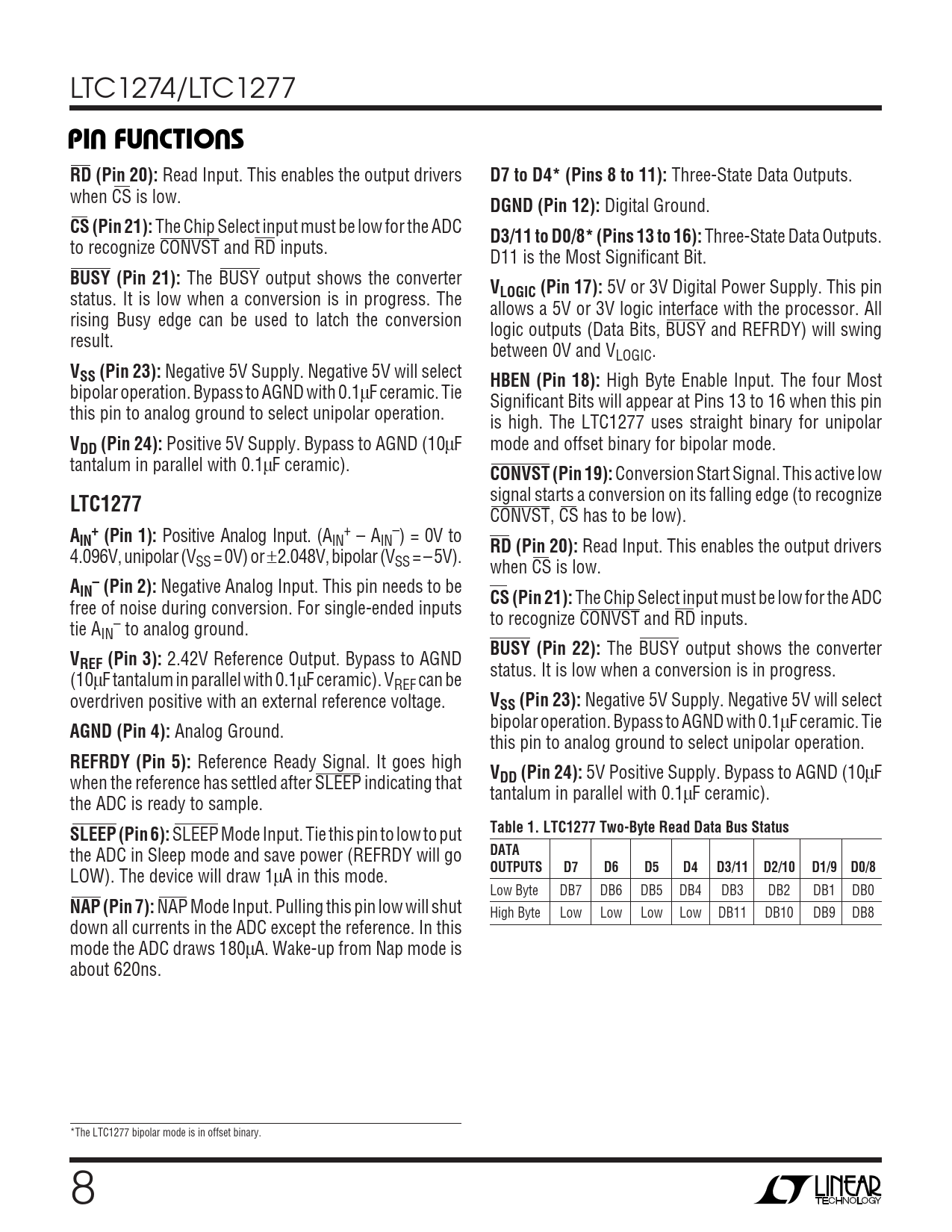 High Byte Enable Input. The four Most bipolar operation. Bypass to AGND with 0.1µF ceramic. Tie Significant Bits will appear at Pins 13 to 16 when this pin this pin to analog ground to select unipolar operation. is high. The LTC1277 uses straight binary for unipolar