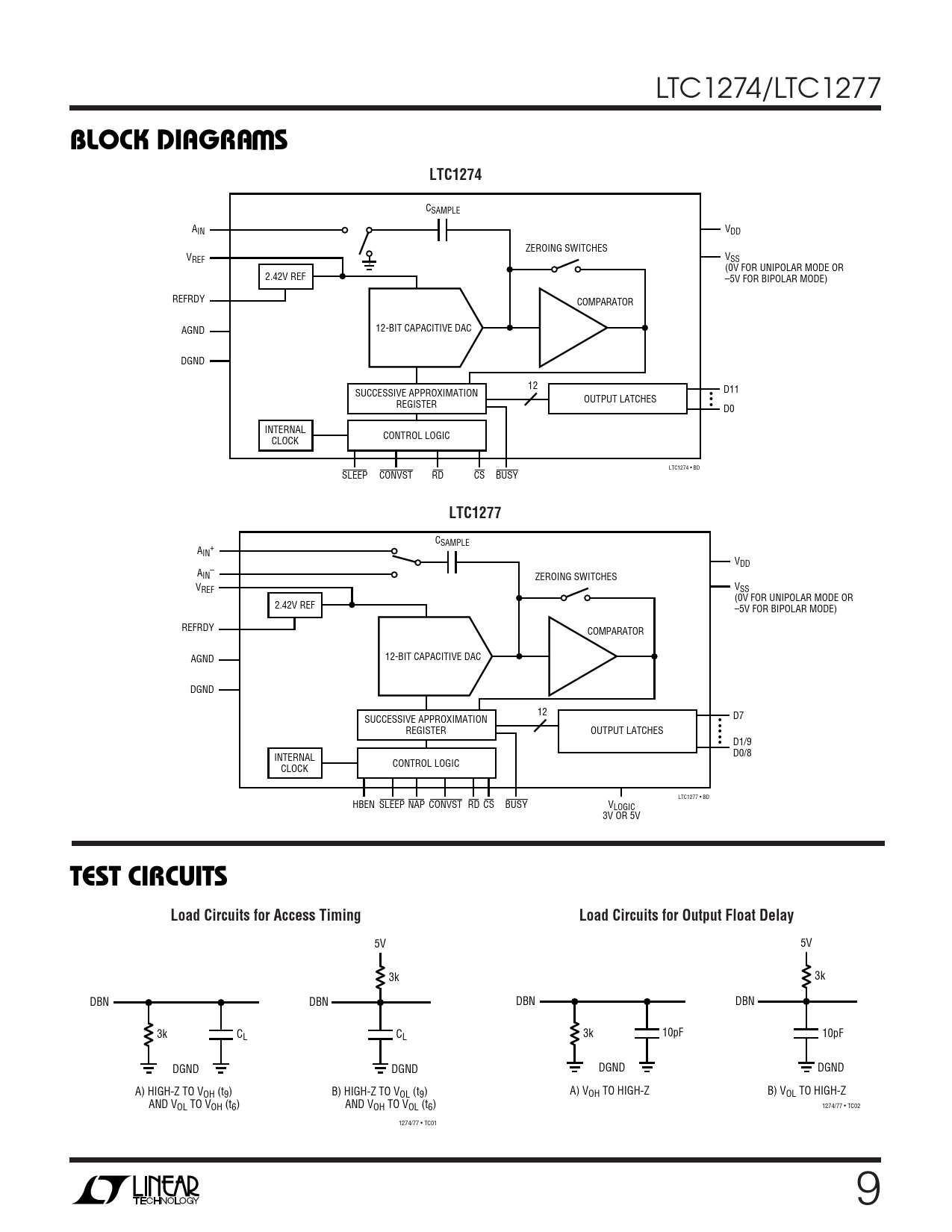 LTC1274/LTC1277 WBLOCK DIAGRA SLTC1274 CSAMPLE A V IN DD ZEROING SWITCHES V V REF SS (0V FOR UNIPOLAR MODE OR 2.42V REF –5V FOR BIPOLAR MODE) REFRDY COMPARATOR 12-BIT CAPACITIVE DAC AGND DGND 12 SUCCESSIVE APPROXIMATION • D11 OUTPUT LATCHES • REGISTER • D0 INTERNAL CONTROL LOGIC CLOCK LTC1274 • BD SLEEP CONVST RD CS BUSY LTC1277 CSAMPLE A + IN VDD A – IN ZEROING SWITCHES V V REF SS (0V FOR UNIPOLAR MODE OR 2.42V REF –5V FOR BIPOLAR MODE) REFRDY COMPARATOR 12-BIT CAPACITIVE DAC AGND DGND 12 D7 SUCCESSIVE APPROXIMATION • • REGISTER OUTPUT LATCHES • • • D1/9 D0/8 INTERNAL CONTROL LOGIC CLOCK LTC1277 • BD HBEN SLEEP NAP CONVST RD CS BUSY VLOGIC 3V OR 5V TEST CIRCUITSLoad Circuits for Access TimingLoad Circuits for Output Float Delay 5V 5V 3k 3k DBN DBN DBN DBN 3k CL CL 3k 10pF 10pF DGND DGND DGND DGND A) HIGH-Z TO VOH (t9) B) HIGH-Z TO VOL (t9) A) VOH TO HIGH-Z B) VOL TO HIGH-Z AND VOL TO VOH (t6) AND VOH TO VOL (t6) 1274/77 • TC02 1274/77 • TC01 9