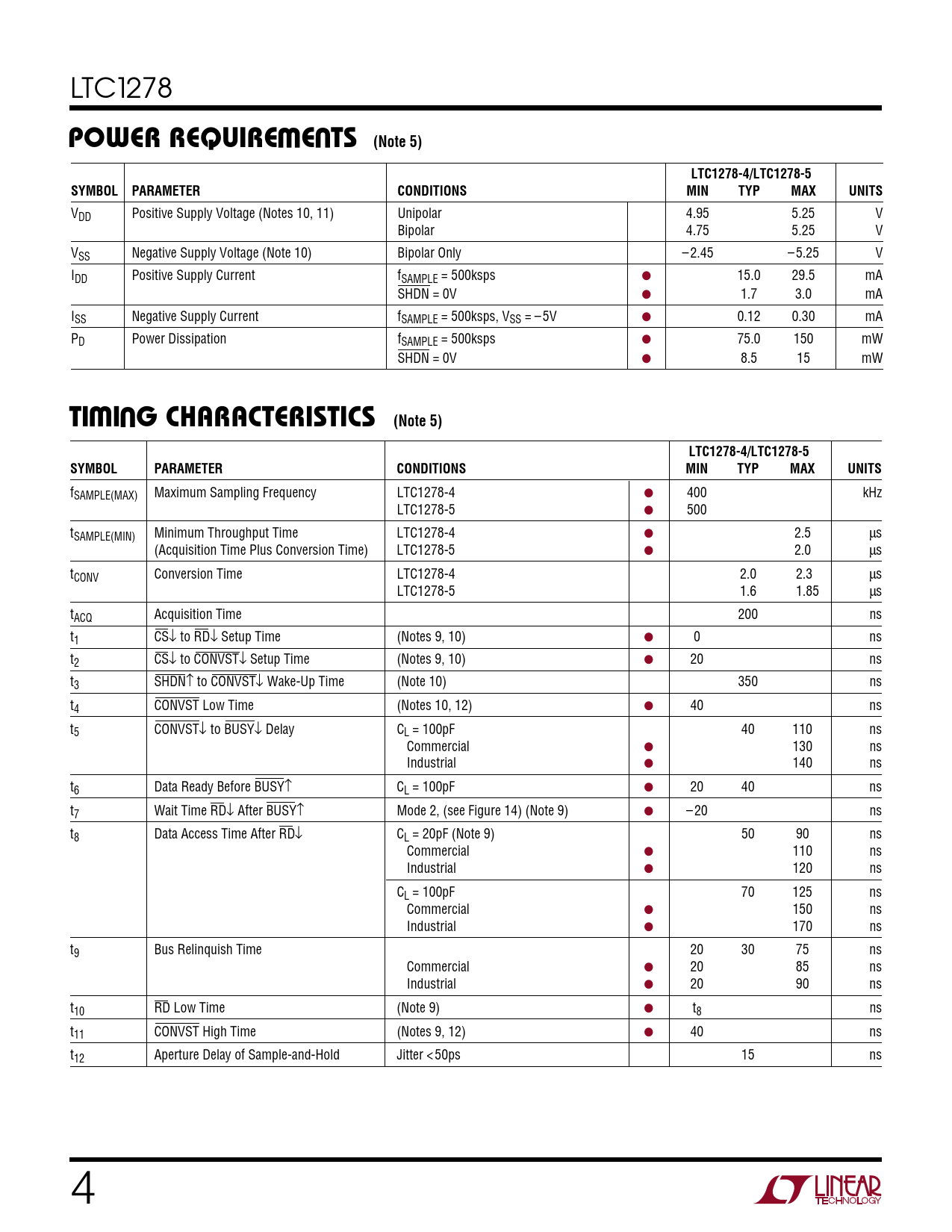 W U. POWER REQUIRE E TS (Note 5). LTC1278-4/LTC1278-5. SYMBOL. PARAMETER. CONDITIONS. MIN. TYP. MAX. UNITS. TI I G CHARACTERISTICS (Note 5)