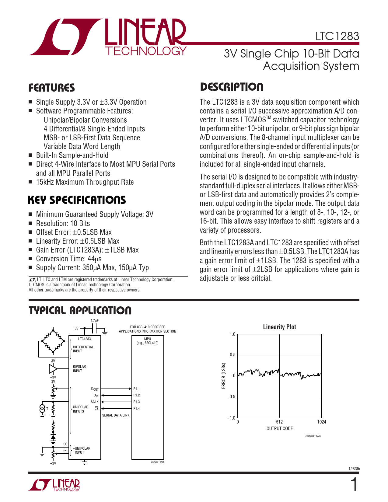 LTC1283 3V Single Chip 10-Bit Data Acquisition System UFEATUSREDESCRIPTIO ■ Single Supply 3.3V or ±3.3V Operation The LTC1283 is a 3V data acquisition component which ■ Software Programmable Features: contains a serial I/O successive approximation A/D con- Unipolar/Bipolar Conversions verter. It uses LTCMOSTM switched capacitor technology 4 Differential/8 Single-Ended Inputs to perform either 10-bit unipolar, or 9-bit plus sign bipolar MSB- or LSB-First Data Sequence A/D conversions. The 8-channel input multiplexer can be Variable Data Word Length configured for either single-ended or differential inputs (or ■ Built-In Sample-and-Hold combinations thereof). An on-chip sample-and-hold is ■ Direct 4-Wire Interface to Most MPU Serial Ports included for all single-ended input channels. and all MPU Parallel Ports The serial I/O is designed to be compatible with industry- ■ 15kHz Maximum Throughput Rate standard full-duplex serial interfaces. It allows either MSB- U or LSB-first data and automatically provides 2’s comple- KEY SPECIFICATIO S ment output coding in the bipolar mode. The output data ■ Minimum Guaranteed Supply Voltage: 3V word can be programmed for a length of 8-, 10-, 12-, or ■ Resolution: 10 Bits 16-bit. This allows easy interface to shift registers and a ■ Offset Error: ±0.5LSB Max variety of processors. ■ Linearity Error: ±0.5LSB Max Both the LTC1283A and LTC1283 are specified with offset ■ Gain Error (LTC1283A): ±1LSB Max and linearity errors less than ±0.5LSB. The LTC1283A has ■ Conversion Time: 44μs a gain error limit of ±1LSB. The 1283 is specified with a ■ Supply Current: 350μA Max, 150μA Typ gain error limit of ±2LSB for applications where gain is , LT, LTC and LTM are registered trademarks of Linear Technology Corporation. adjustable or less critcial. LTCMOS is a trademark of Linear Technology Corporation. All other trademarks are the property of their respective owners. OUTYPICAL APPLICATI 4.7μF FOR 83CL410 CODE SEE 3V Linearity Plot APPLICATIONS INFORMATION SECTION 1.0 LTC1283 MPU (e.g., 83CL410) DIFFERENTIAL INPUT 0.5 3V BIPOLAR INPUT 0 –3V 3V ERROR (LSBs) D P1.1 OUT D P1.2 IN –0.5 SCLK P1.3 T UNIPOLAR CS P1.4 INPUTS SERIAL DATA LINK – 1.0 0 512 1024 OUTPUT CODE LTC1283 • TA02 (+) –UNIPOLAR (–) INPUT –3V LTC1283 • TA01 1283fb 1