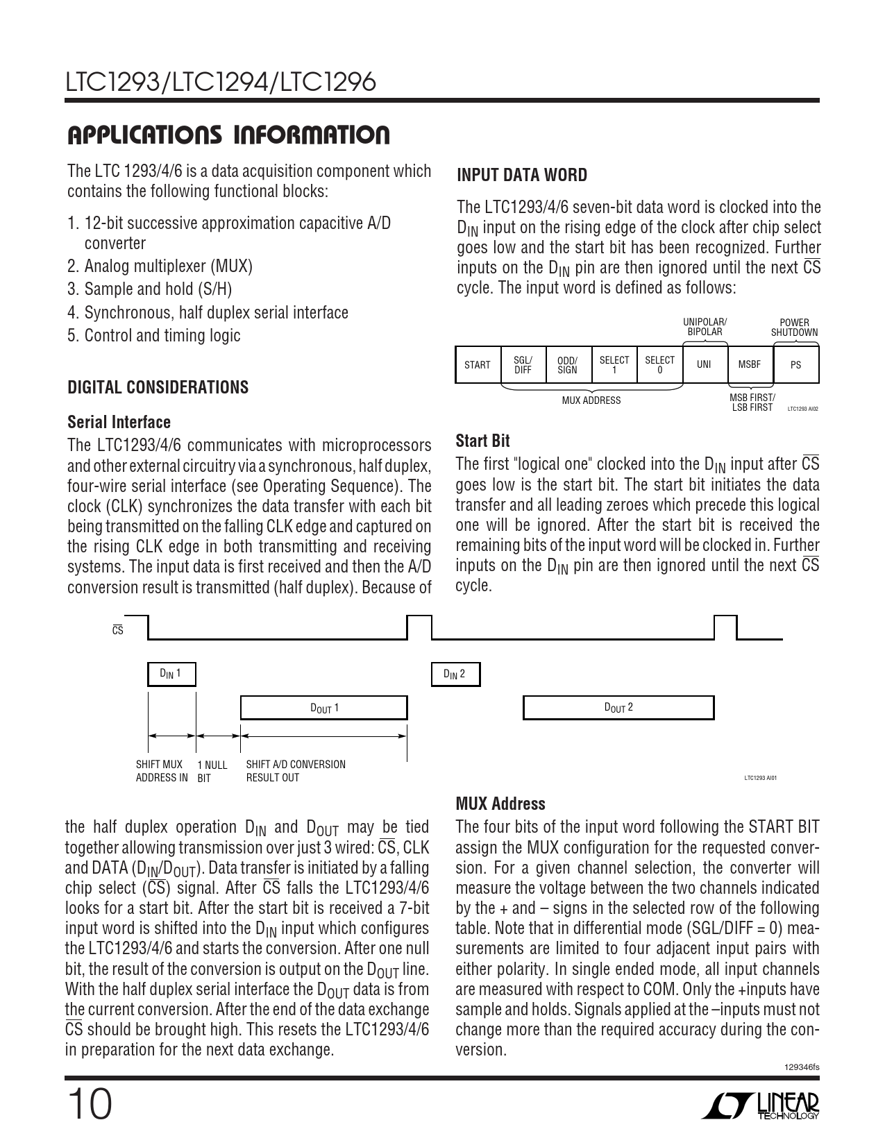 LTC1293/LTC1294/LTC1296 OUUWUAPPLICATIS I FOR ATIO The LTC 1293/4/6 is a data acquisition component which INPUT DATA WORD contains the following functional blocks: The LTC1293/4/6 seven-bit data word is clocked into the 1. 12-bit successive approximation capacitive A/D DIN input on the rising edge of the clock after chip select converter goes low and the start bit has been recognized. Further 2. Analog multiplexer (MUX) inputs on the DIN pin are then ignored until the next CS 3. Sample and hold (S/H) cycle. The input word is defined as follows: 4. Synchronous, half duplex serial interface UNIPOLAR/ POWER 5. Control and timing logic BIPOLAR SHUTDOWN START SGL/ ODD/ SELECT SELECT UNI MSBF DIFF PS SIGN 1 0 DIGITAL CONSIDERATIONS MUX ADDRESS MSB FIRST/ LSB FIRST LTC1293 AI02 Serial InterfaceStart Bit The LTC1293/4/6 communicates with microprocessors and other external circuitry via a synchronous, half duplex, The first "logical one" clocked into the DIN input after CS four-wire serial interface (see Operating Sequence). The goes low is the start bit. The start bit initiates the data clock (CLK) synchronizes the data transfer with each bit transfer and all leading zeroes which precede this logical being transmitted on the falling CLK edge and captured on one will be ignored. After the start bit is received the the rising CLK edge in both transmitting and receiving remaining bits of the input word will be clocked in. Further systems. The input data is first received and then the A/D inputs on the DIN pin are then ignored until the next CS conversion result is transmitted (half duplex). Because of cycle. CS DIN 1 DIN 2 D D OUT 1 OUT 2 SHIFT MUX 1 NULL SHIFT A/D CONVERSION ADDRESS IN BIT RESULT OUT LTC1293 AI01 MUX Address the half duplex operation DIN and DOUT may be tied The four bits of the input word following the START BIT together allowing transmission over just 3 wired: CS, CLK assign the MUX configuration for the requested conver- and DATA (DIN/DOUT). Data transfer is initiated by a falling sion. For a given channel selection, the converter will chip select (CS) signal. After CS falls the LTC1293/4/6 measure the voltage between the two channels indicated looks for a start bit. After the start bit is received a 7-bit by the + and – signs in the selected row of the following input word is shifted into the DIN input which configures table. Note that in differential mode (SGL/DIFF = 0) mea- the LTC1293/4/6 and starts the conversion. After one null surements are limited to four adjacent input pairs with bit, the result of the conversion is output on the DOUT line. either polarity. In single ended mode, all input channels With the half duplex serial interface the DOUT data is from are measured with respect to COM. Only the +inputs have the current conversion. After the end of the data exchange sample and holds. Signals applied at the –inputs must not CS should be brought high. This resets the LTC1293/4/6 change more than the required accuracy during the con- in preparation for the next data exchange. version. 129346fs 10